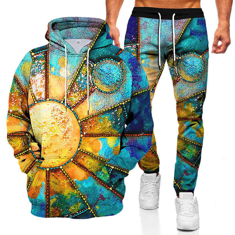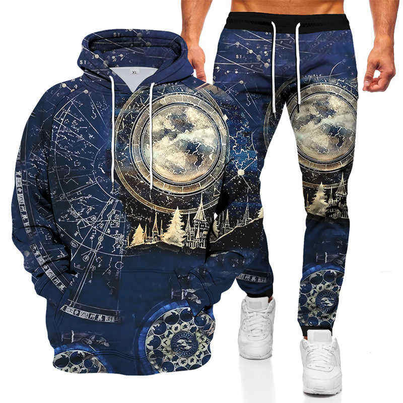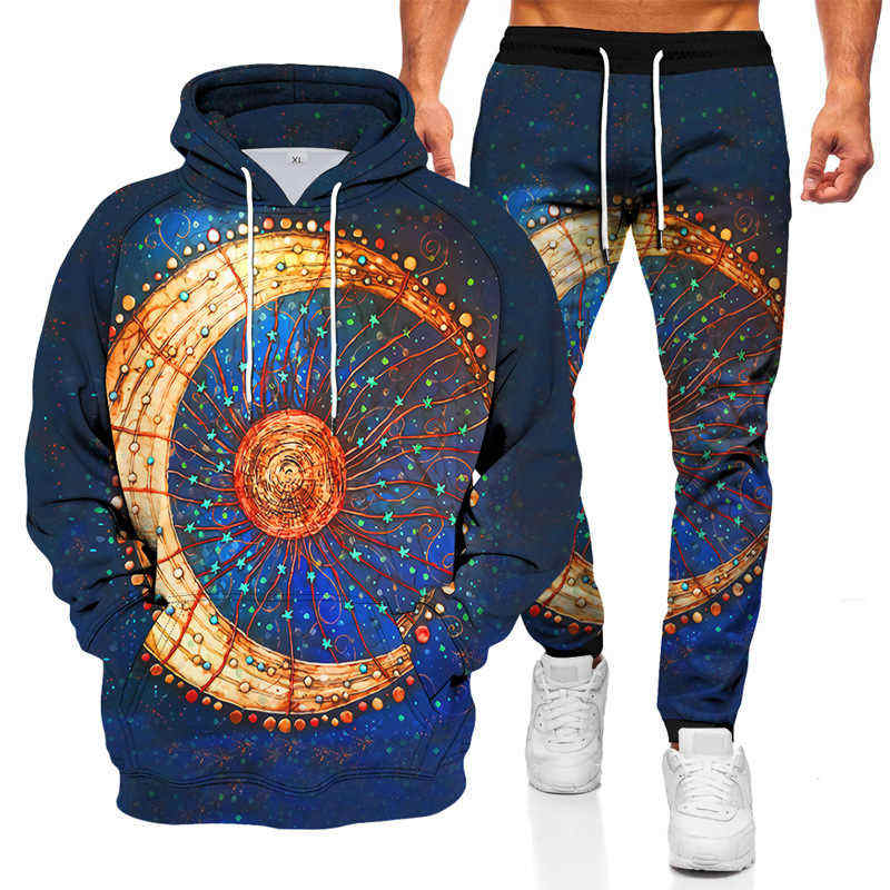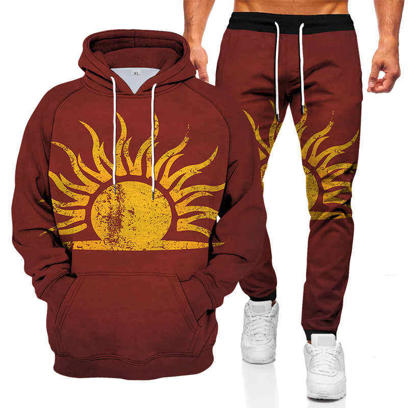 ชุดฮู้ดดี้ผู้ชายใหม่ปี 2023 ลายพระอาทิตย์พระจันทร์ คอเสื้อพิมพ์ลาย แขนยาว เอวยางยืด แห้งเร็ว ผ้าฝ้าย 100% ไซส์ใหญ่ สไตล์คู่รัก