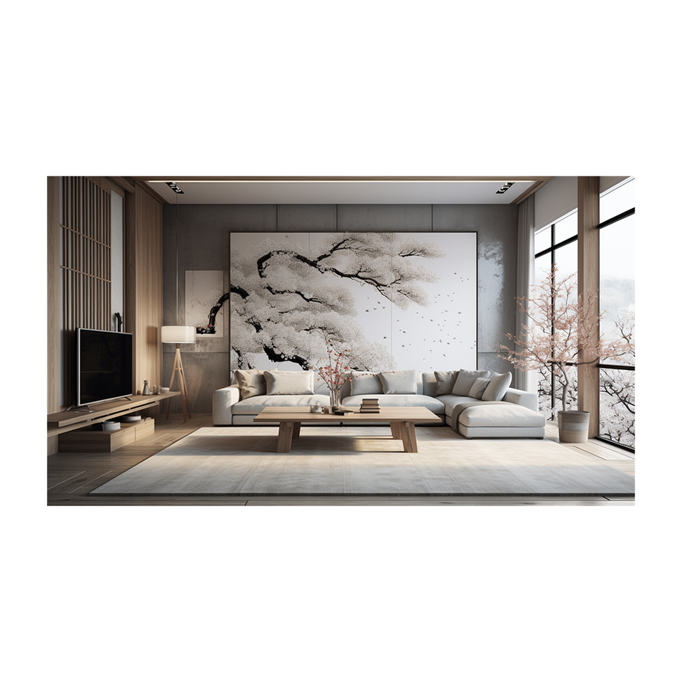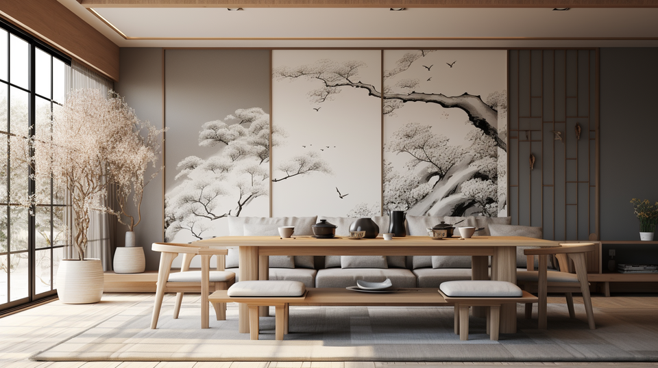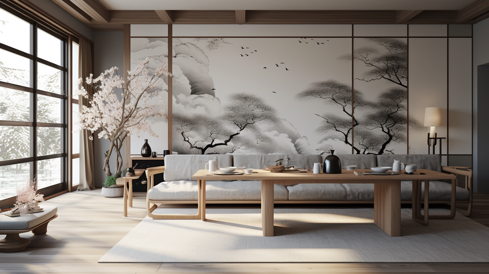 2024 Ai การออกแบบแนวคิดสร้างสรรค์สำหรับเฟอร์นิเจอร์บ้านสไตล์เซนแบบญี่ปุ่น3D บริการเรนเดอร์ภายในสำหรับพื้นที่ห้องนั่งเล่น