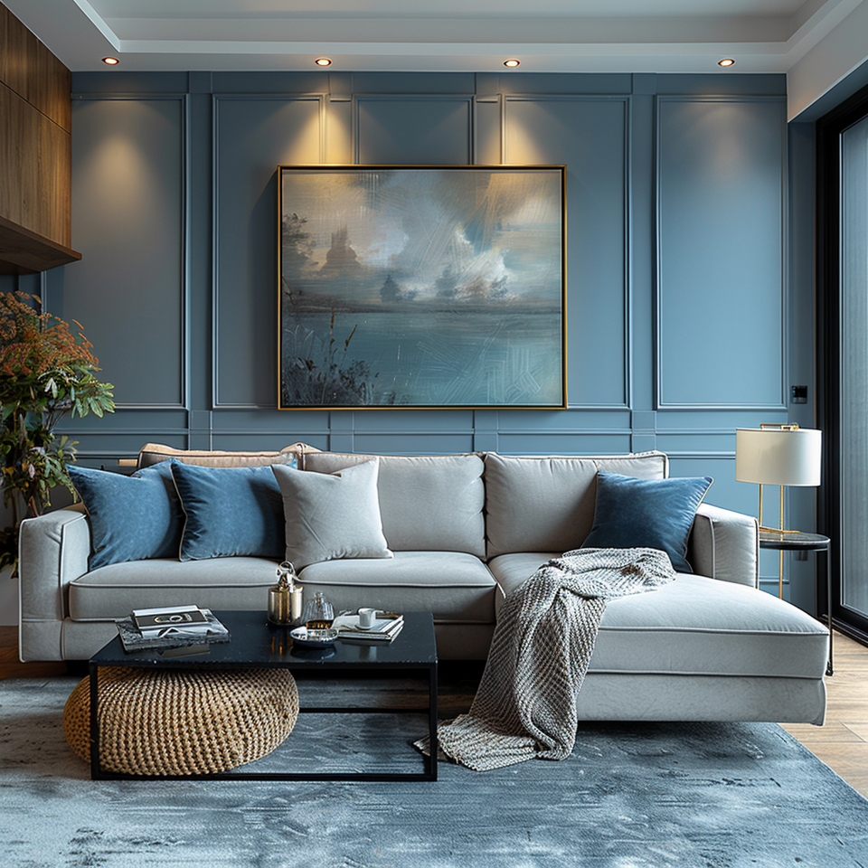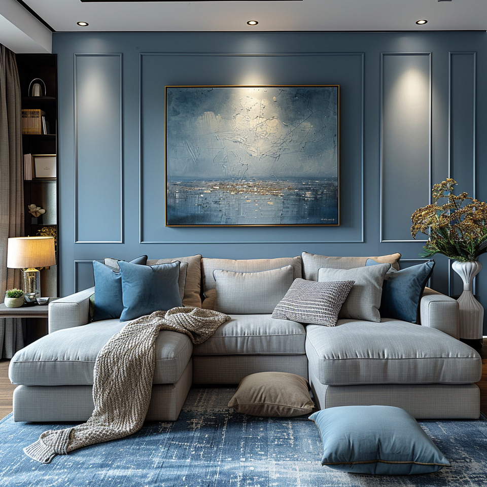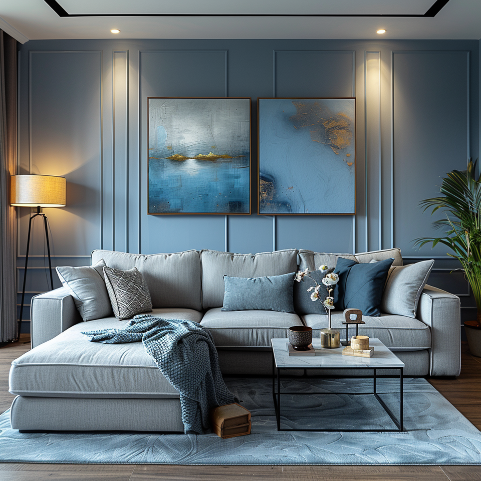2024ไอเฟอร์นิเจอร์บ้านทันสมัยทันสมัยแนวคิดที่สร้างสรรค์การออกแบบห้องนั่งเล่นเน้นสีเทาและสีน้ำเงิน