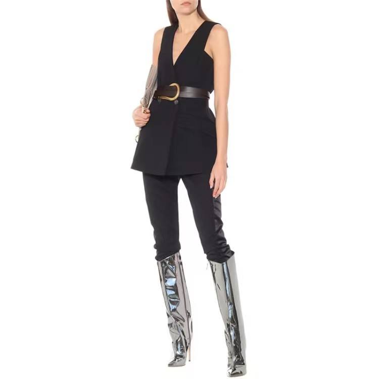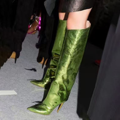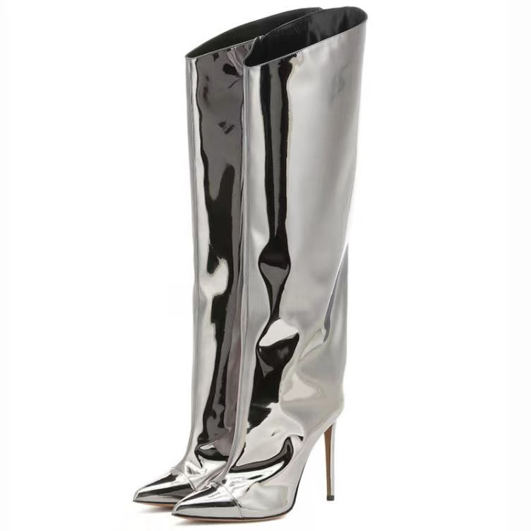 คอลเลคชั่นฤดูใบไม้ร่วงและฤดูหนาวปี 2024 รองเท้าบูทเปิดนิ้วเท้าสำหรับผู้หญิง หนังมันวาว ไซส์ใหญ่พิเศษ ดีไซน์ทันสมัย