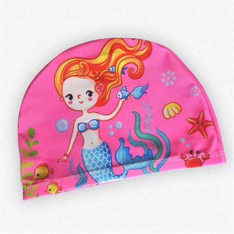 หมวกว่ายน้ำโพลีเอสเตอร์สำหรับเด็กหมวกว่ายน้ำลายการ์ตูนสีสันสดใส2024ออกแบบโลโก้ได้ตามต้องการ