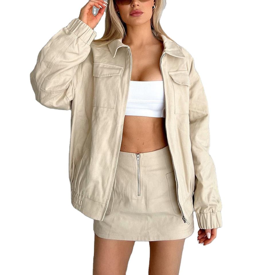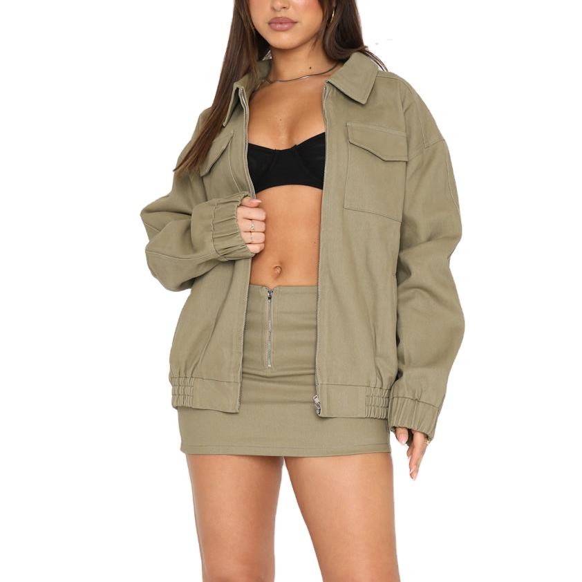 ชุดเซ็ตเสื้อแจ็คเก็ตและกระโปรงมินิสเกิร์ตแบบคาร์โก้ 2 ชิ้น ผ้าถักคุณภาพสูง ติดกระดุม ซิป ลุคสบายๆ สไตล์ลำลอง สำหรับฤดูร้อน ปี 2024 สีพื้น ลุคซักแล้ว สำหรับผู้หญิง