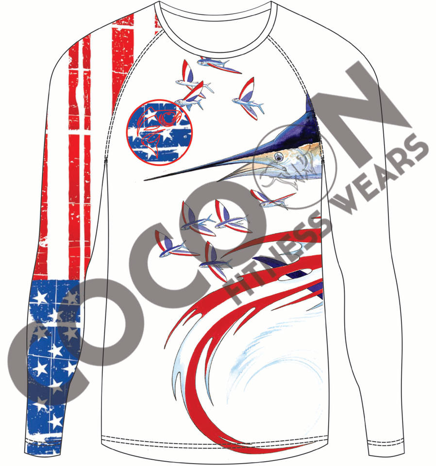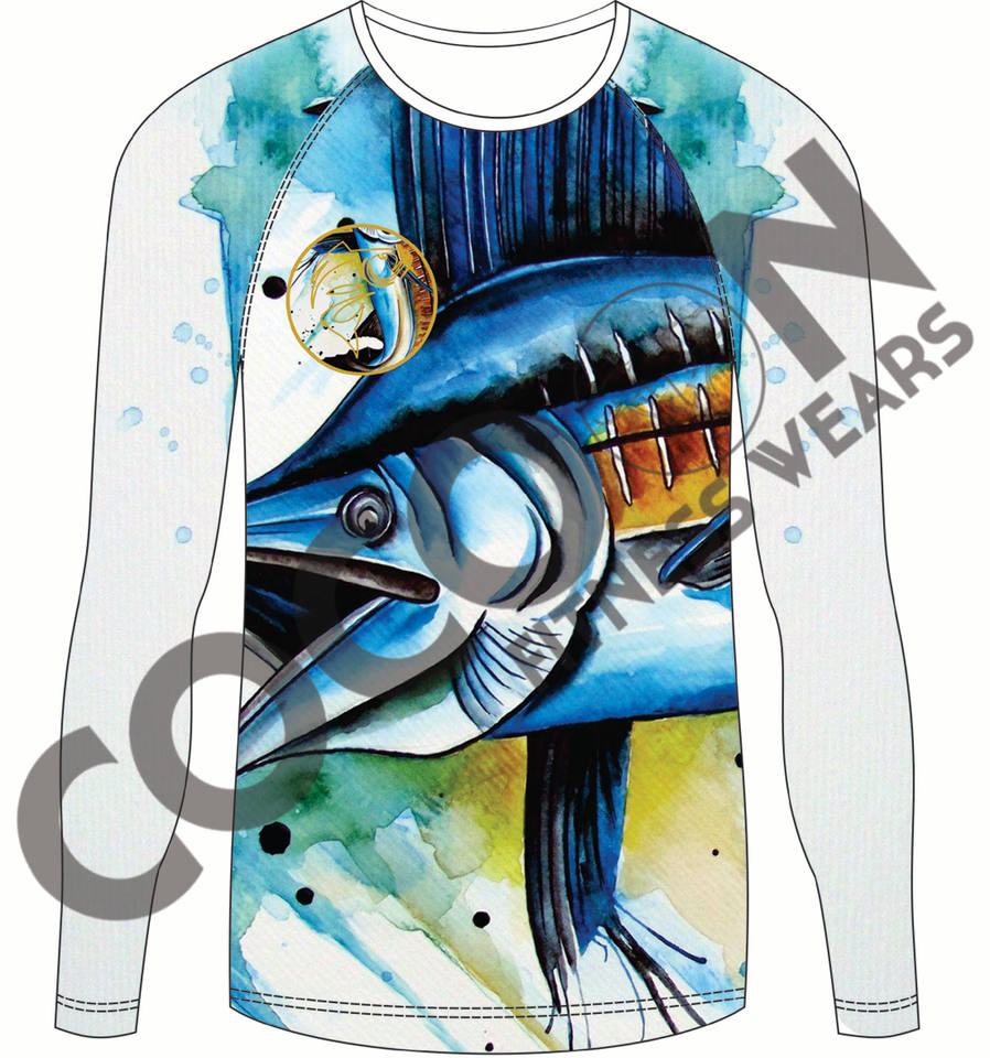 เสื้อตกปลาพิมพ์ลายปลามาร์ลินเสื้อสำหรับ2024 100% ผ้าโพลีเอสเตอร์แห้งเร็วออกแบบได้ตามต้องการ