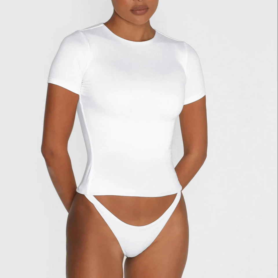 2024เสื้อยืดคอกลมแขนสั้นสำหรับผู้หญิงเสื้อยืด Y2K เข้ารูปผ้าฝ้ายสีขาวล้วนแบบสวมหัว