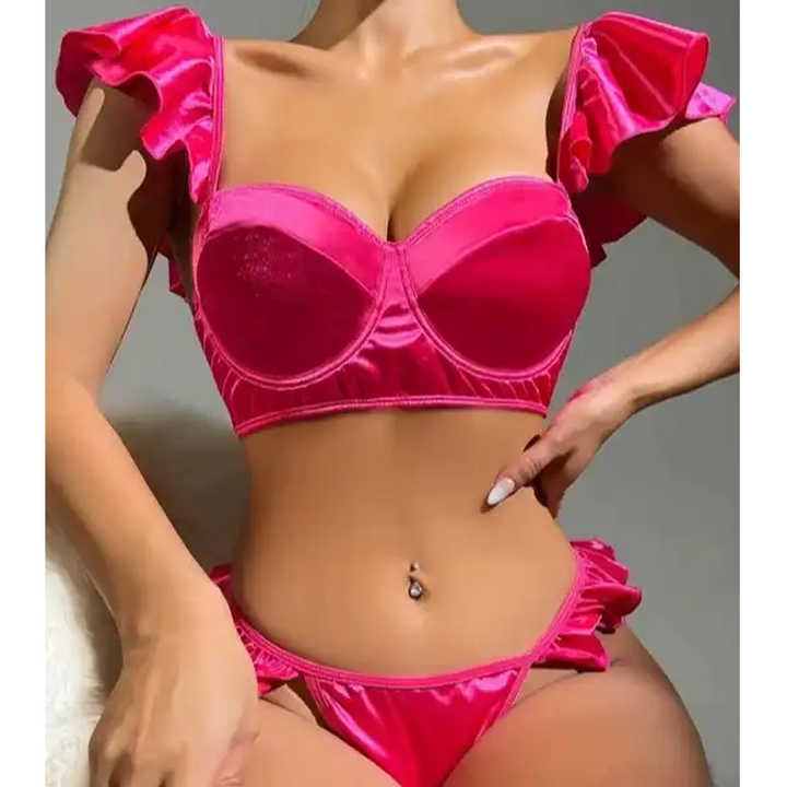 ชุดชั้นในซีทรูผ้าซาตินสีชมพูนีออนแบบมีโครงลวด แต่งระบาย สายรัด ดีไซน์หรูหรา สำหรับผู้หญิงเซ็กซี่ ปี 2024