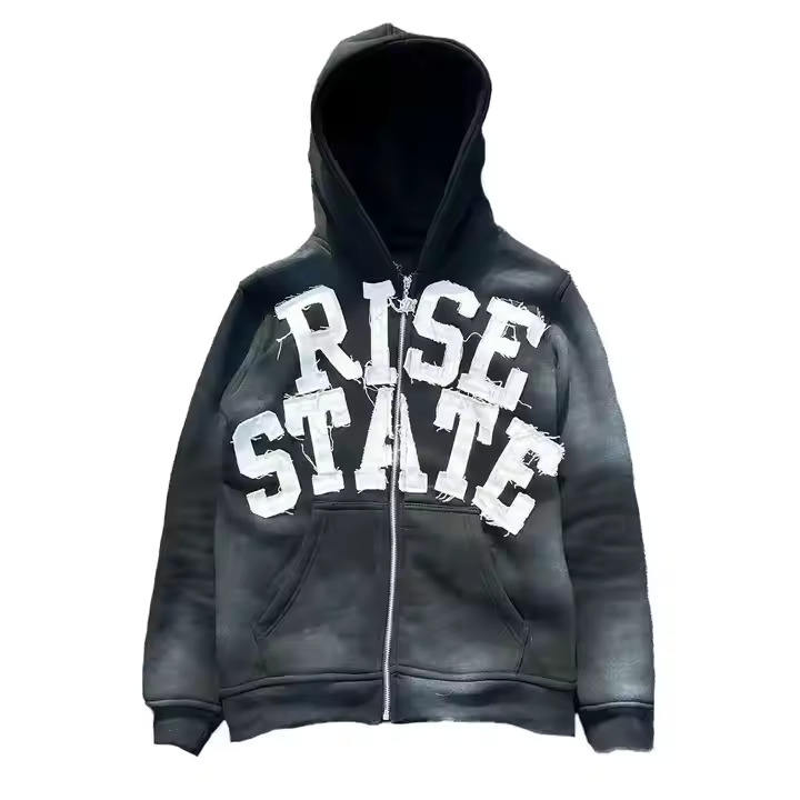 2024 Custom LOGO Patch Embroidery Faded Latest French Terry Distressed Embroidered Zip up Acid Wash Thermal Hoodies for Men