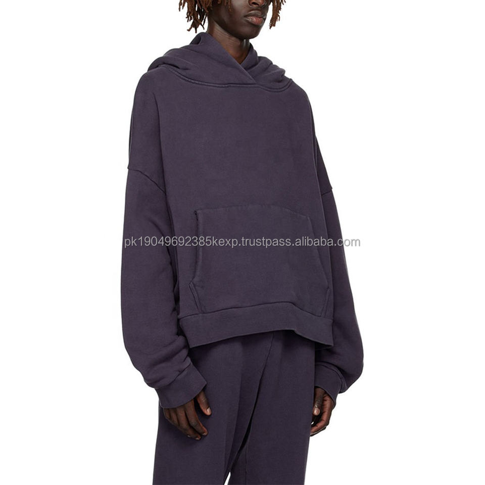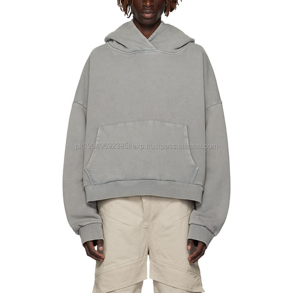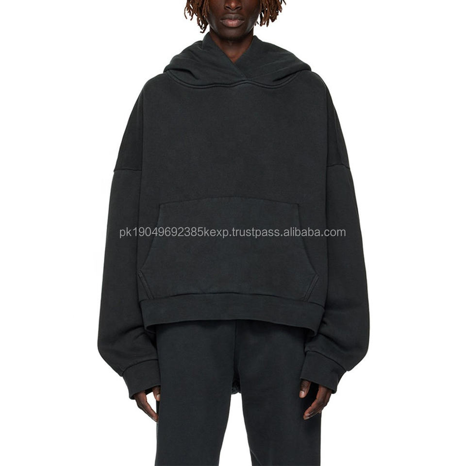เสื้อฮู้ดดี้ทรงบ็อกซี่แบบครอปสำหรับผู้ชาย ปี 2026 พร้อมโลโก้สั่งทำพิเศษ ผ้าฟอกสี 500gsm คุณภาพสูง ทรงโอเวอร์ไซส์ สีดำ ลุคทำเก่า