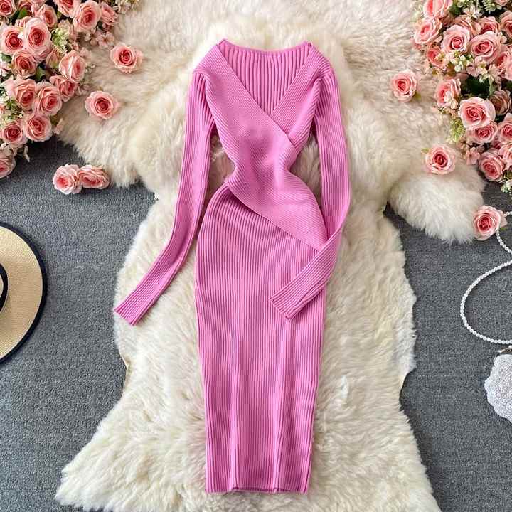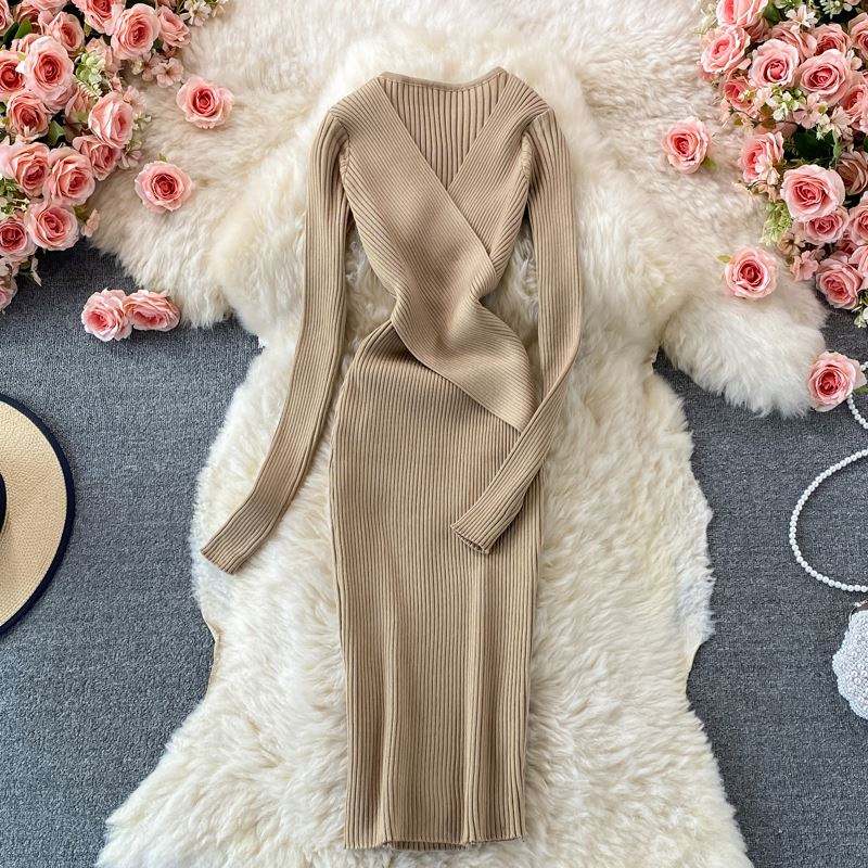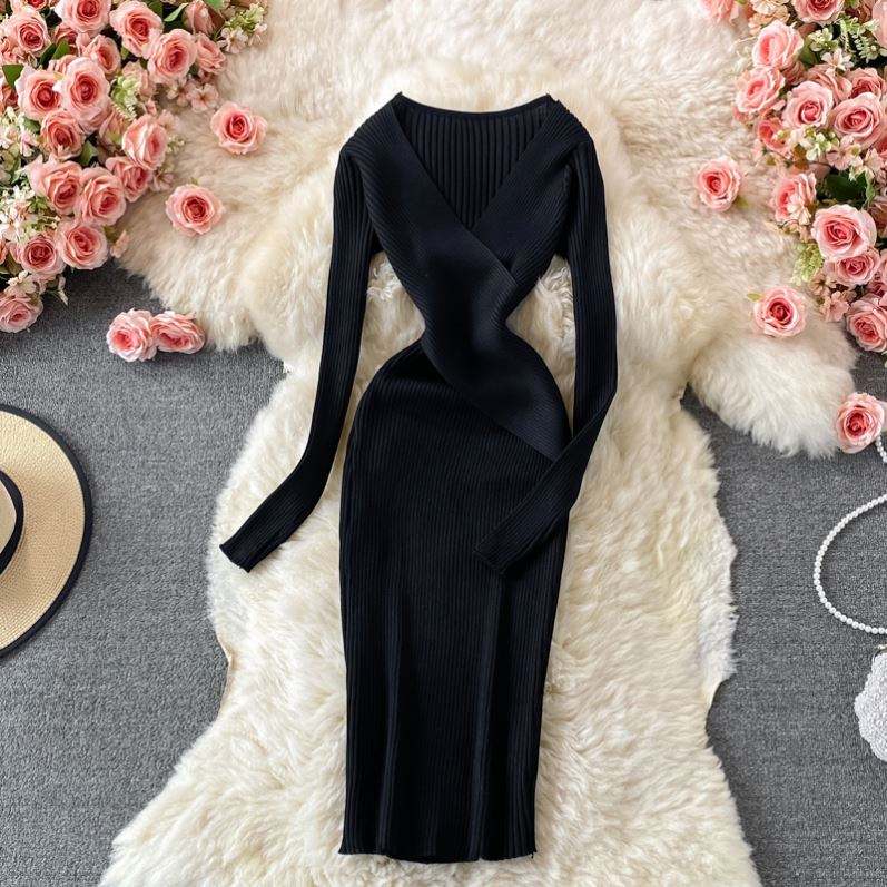 เดรสยาวทรงเข้ารูปคอวีถักโครเชต์สไตล์ลำลองสีพื้นสำหรับผู้หญิง ประดับลูกไม้สไตล์วินเทจสีดำ คอลเลคชั่นฤดูใบไม้ร่วง 2024