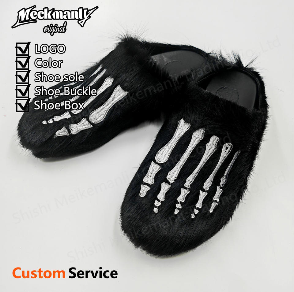 รองเท้าแตะแบบสวมบุขนนุ่มปักลายแฟชั่นผู้ชายปี 2024 รองเท้าลำลองบุขนนุ่มสำหรับฤดูหนาว