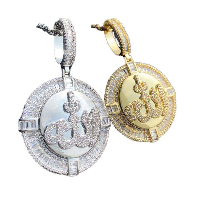 สร้อยคอจี้ฮิปฮอปปี 2024 ประดับเพชรคิวบิกเซอร์โคเนียรูปอัลลอฮ์ พร้อมสร้อยเชือกฟรี
