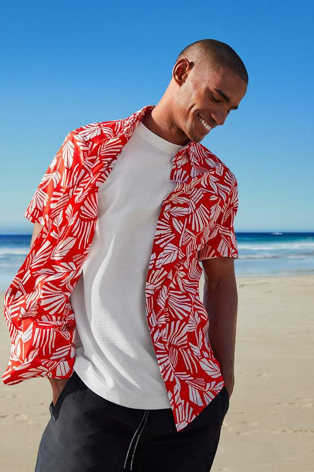 เสื้อเชิ้ตฮาวายแขนสั้นสำหรับผู้ชายสีแดงออกใหม่2024