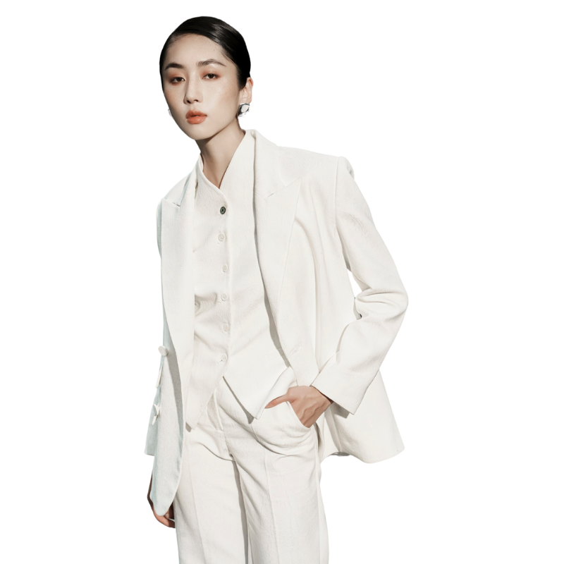 เสื้อสูทสตรีแบบหรูหรามีกระเป๋าด้านหน้าของ2024เสื้อเบลเซอร์หยักผ้าทอสีขาวขาวสไตล์เวียดนาม
