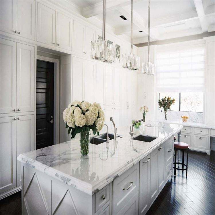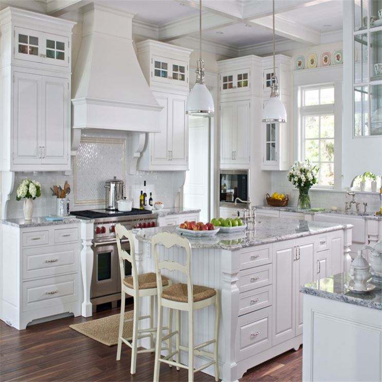 ตู้ครัวสำเร็จรูปสีขาวทันสมัยปี 2024 พร้อมชุดครัวแบบมีไอส์แลนด์ สำหรับโครงการวิลล่าใหม่ ผลิตจากไม้