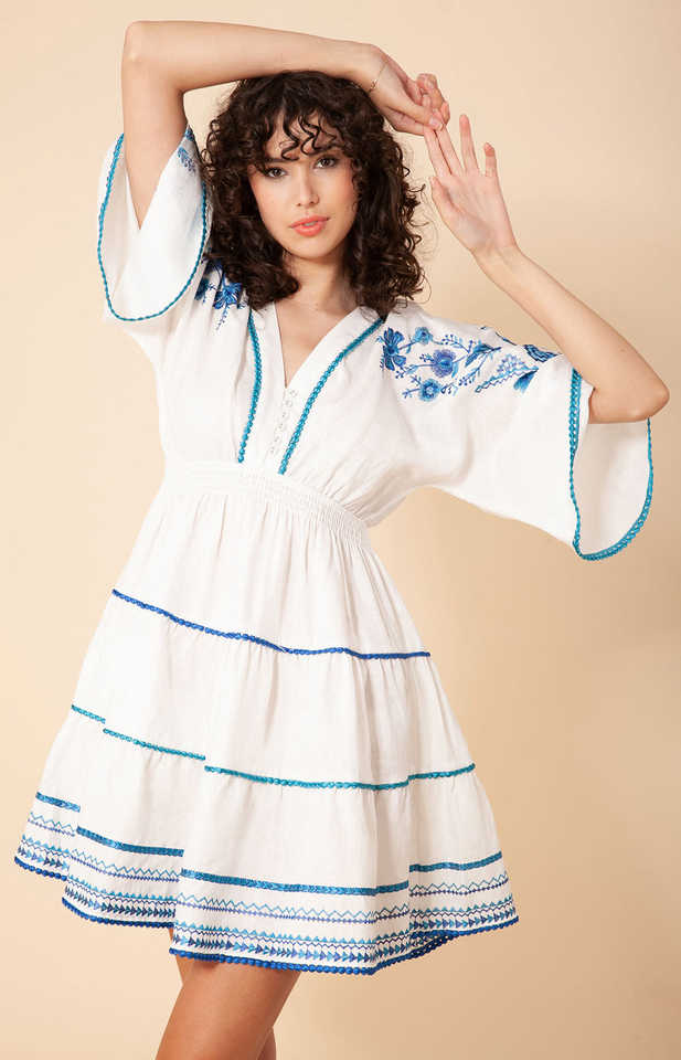 เดรสสั้นของผู้หญิงวินเทจคอวีแขนสามส่วนปักลายดอกไม้2024ฤดูร้อน