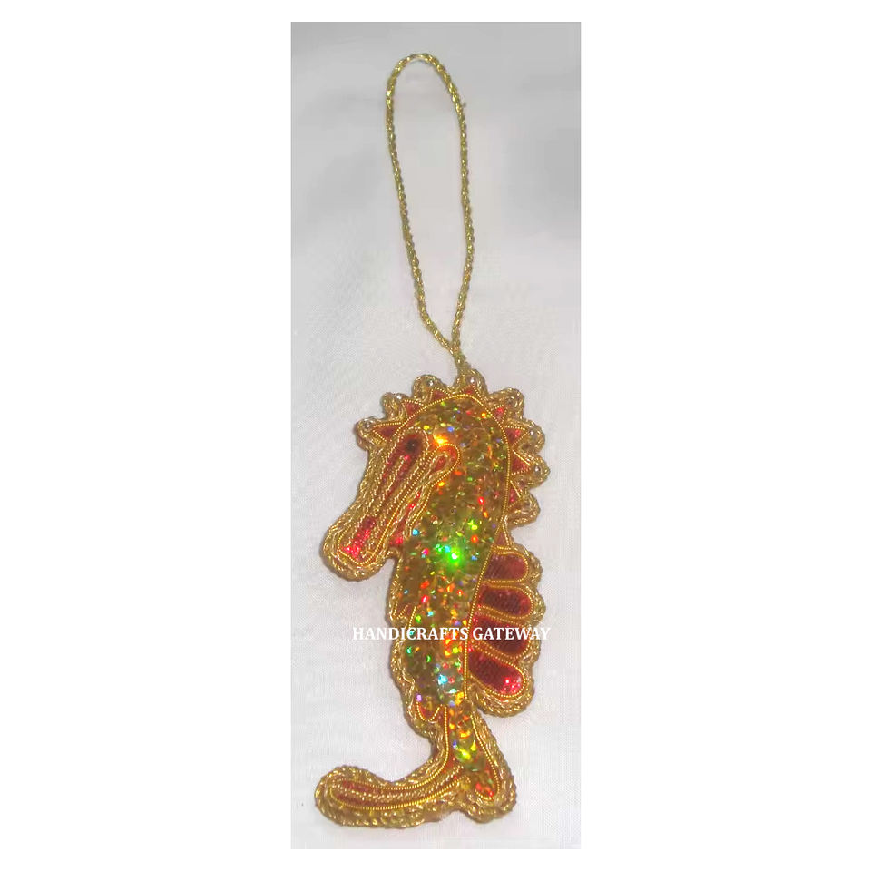 2024ปักลายม้าน้ำสีทอง zari ด้วยลูกปัดแต่งงานกับงานคริสต์มาสเครื่องประดับแขวน