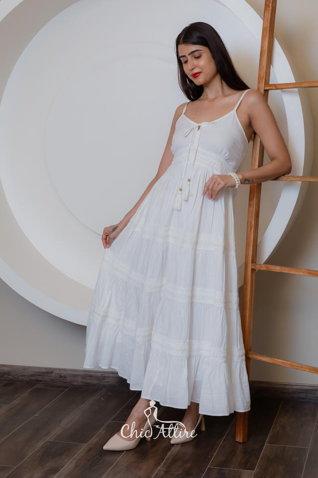ชุดเดรส Maxi หรูหราคอลเลกชั่นใหม่สำหรับผู้หญิงเดรสผ้าฝ้ายสีขาวระบายอากาศพร้อมรายละเอียดพู่และกระโปรงเป็นชั้นสำหรับ2024