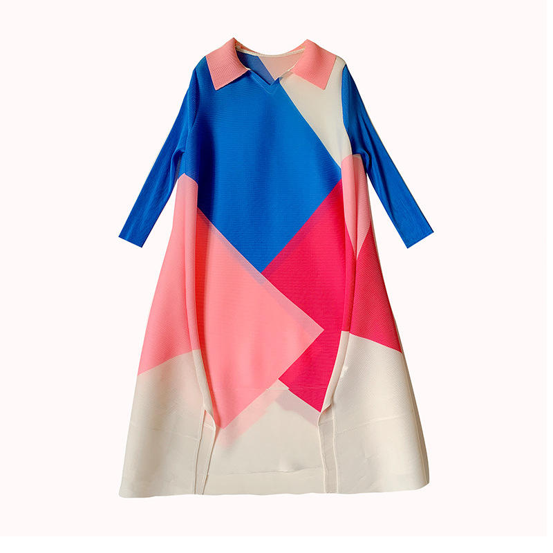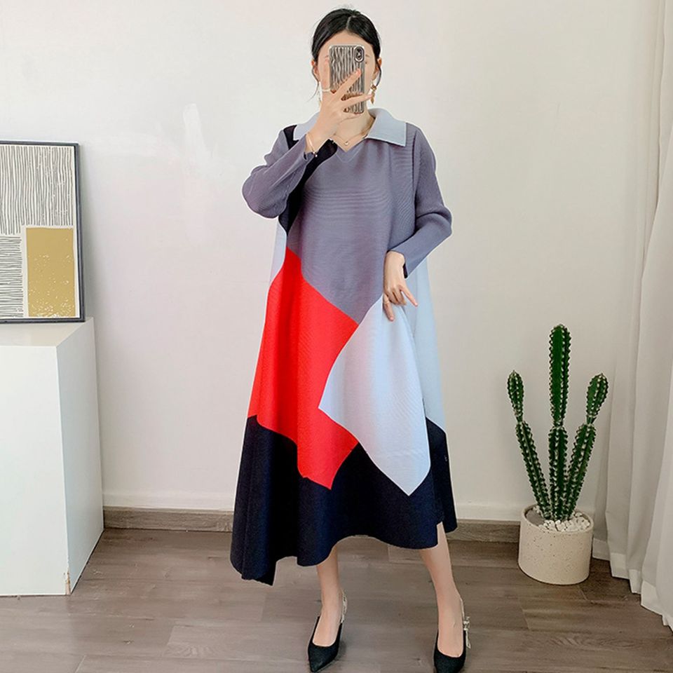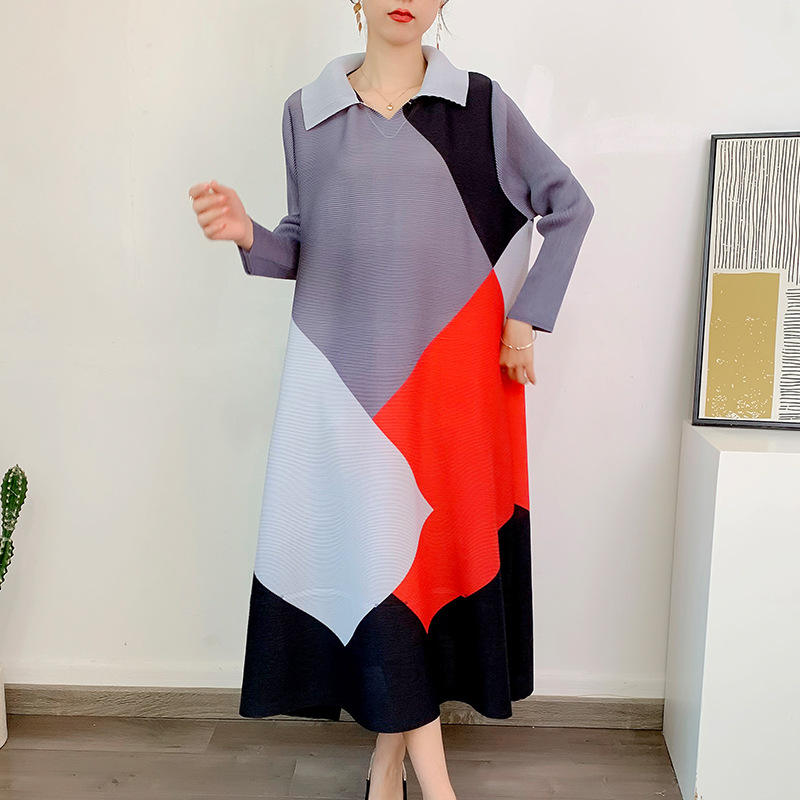 2024 New Color Pleated Dress Ladies Color Matching Large Size Loose Elastic Medium Long Dresses Women Clothing Factory Wholesale