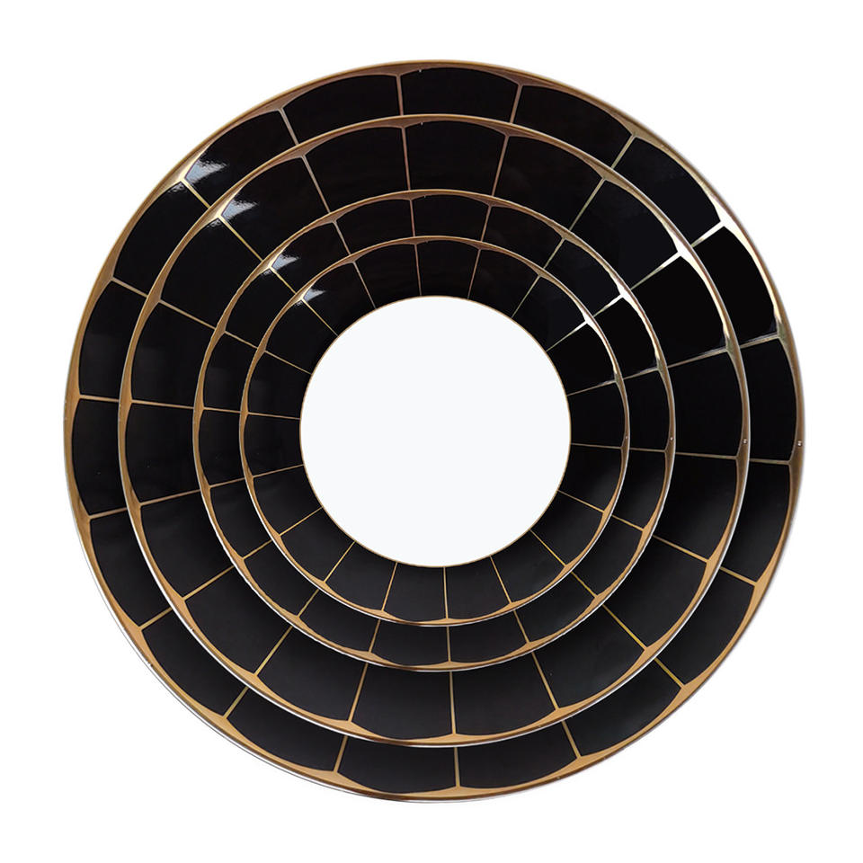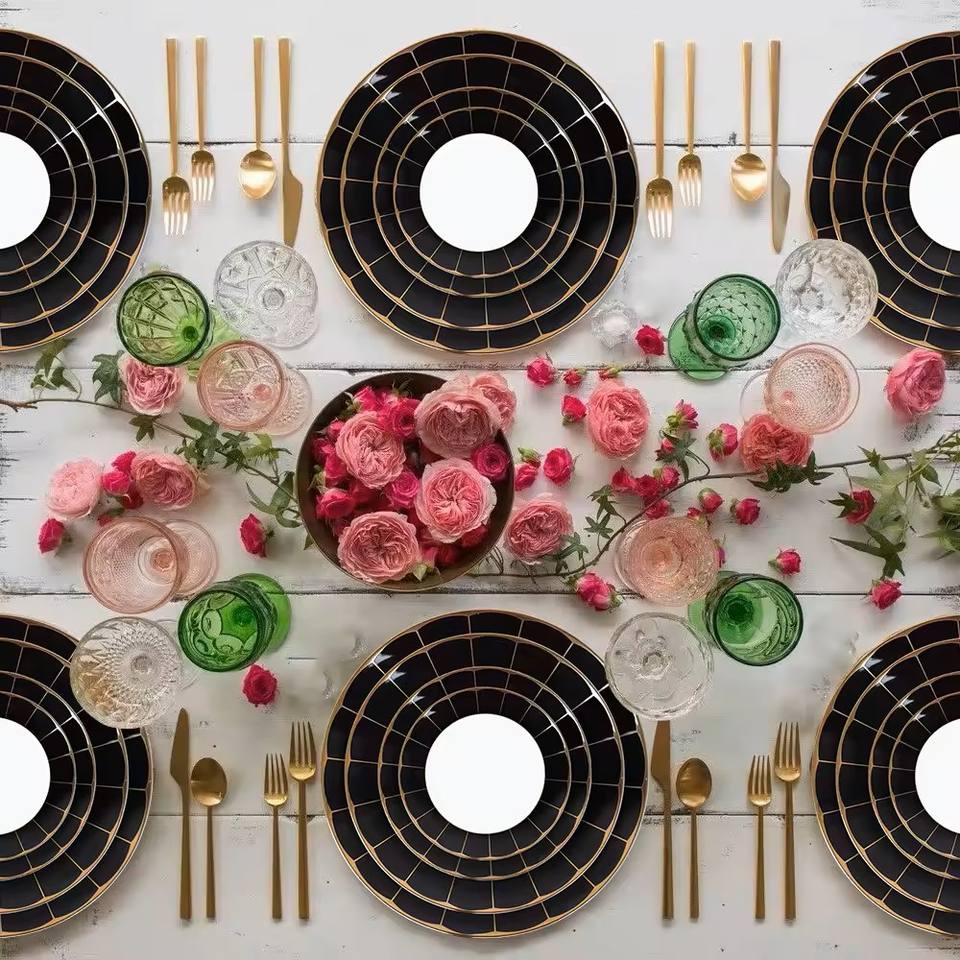 ชุดจานชามเซรามิกและจานสำหรับใช้ในงานเลี้ยงอาหารชุดอุปกรณ์รับประทานอาหารลายกระดูกพอร์ซเลนสีดำทองแบบใหม่สำหรับพิธีขึ้นบ้านใหม่2024