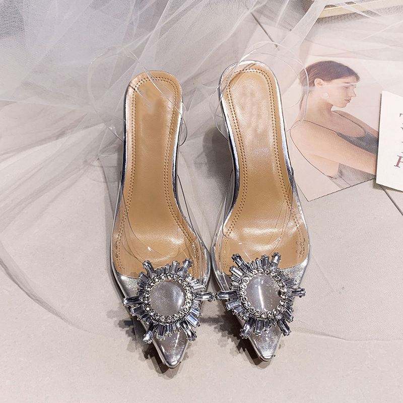 รองเท้าส้นสูงแฟชั่นใส่ได้หลายโอกาสสำหรับผู้หญิง, ใหม่2024ส้นคริสตัลยุโรปและอเมริการองเท้าส้นบางรองเท้าแตะสุดเท่