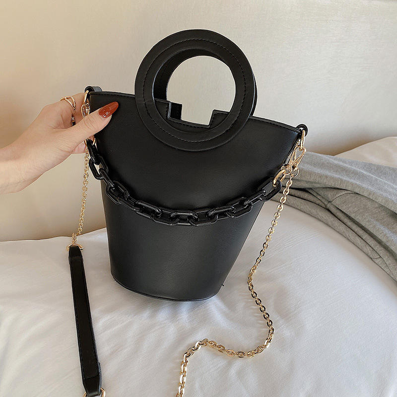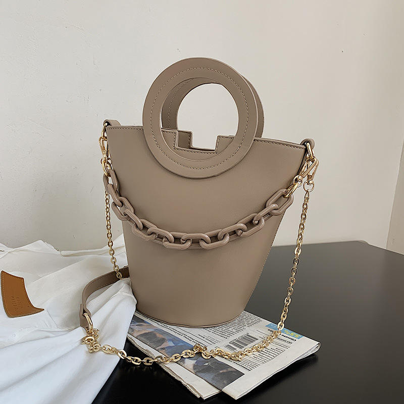 กระเป๋าถือทรงถังแฟชั่นลำลองสำหรับผู้หญิงปี 2024 พร้อมซิปยาว ซับในโพลีเอสเตอร์ สายสะพายโซ่