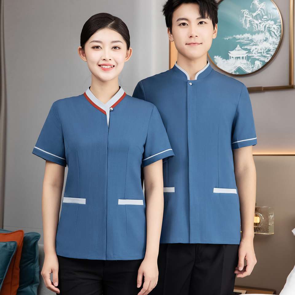 2024ชุดเครื่องแบบพนักงานทำความสะอาดโรงแรมทำจากผ้าฝ้าย100% สีฟ้าโลโก้แบบกำหนดเองเทรนด์ใหม่