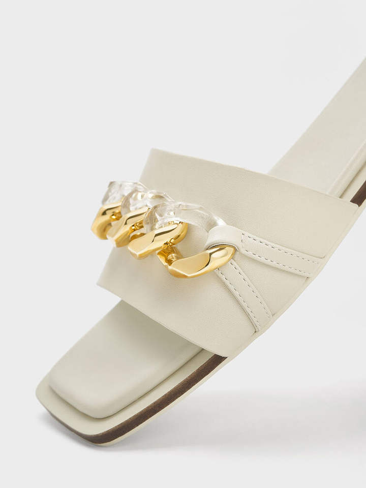 2024รองเท้าส้นเตี้ยหนังแท้แท้สีขาวนวลรองเท้าแตะส้นแบนพร้อมรองเท้าแตะสายโซ่สีทองสำหรับผู้หญิงและสุภาพสตรี