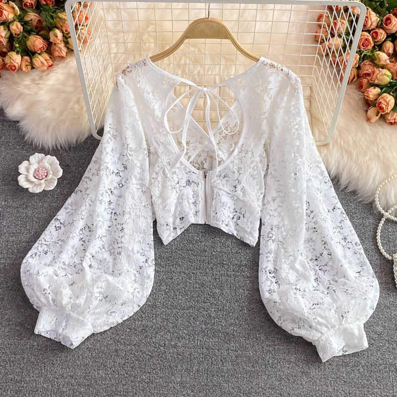 2024เสื้อลูกไม้กลวงออกเซ็กซี่เสื้อคอวีทรงโคมไฟโชว์หลังเสื้อครอปสีพื้นแบบลำลองสไตล์เกาหลีเข้ารูปเสื้อ50%
