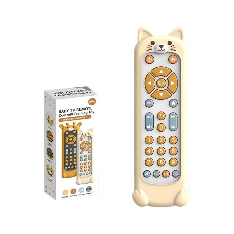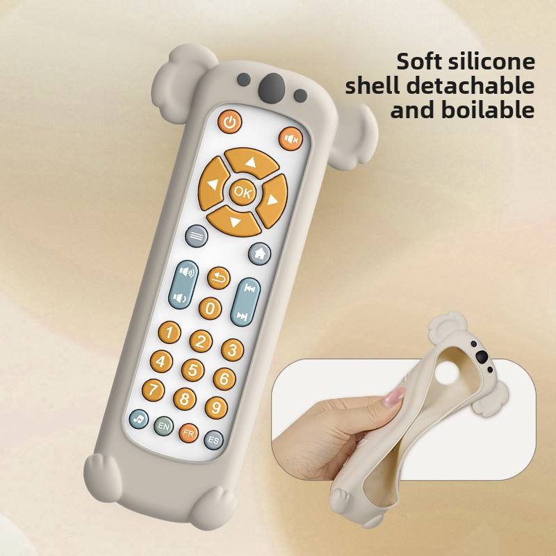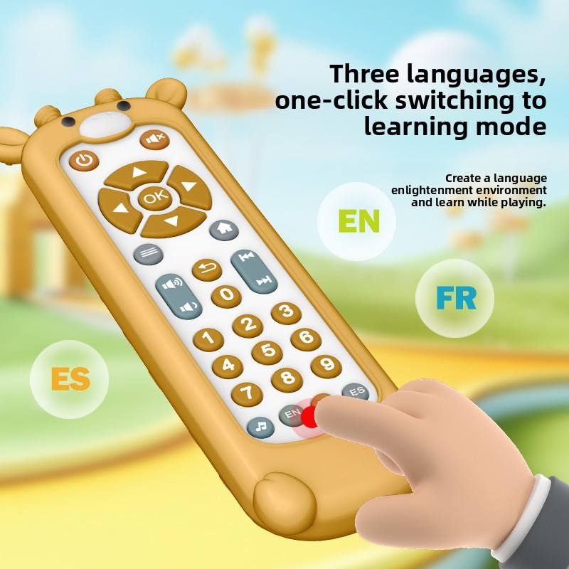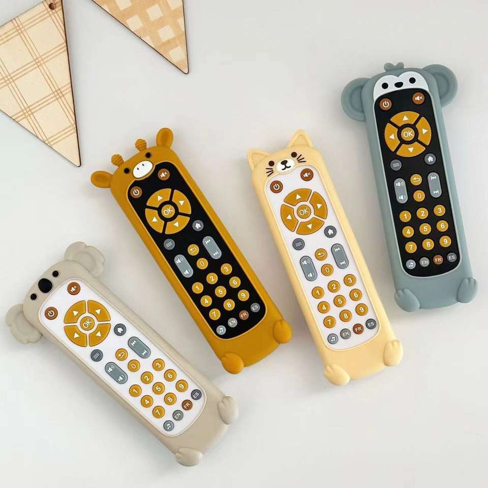 ของเล่นยางกัดซิลิโคนนุ่มปี 2024 รูปทรงรีโมททีวี ของเล่นดนตรีเสริมพัฒนาการสำหรับเด็กทารก พร้อม 3 ภาษา