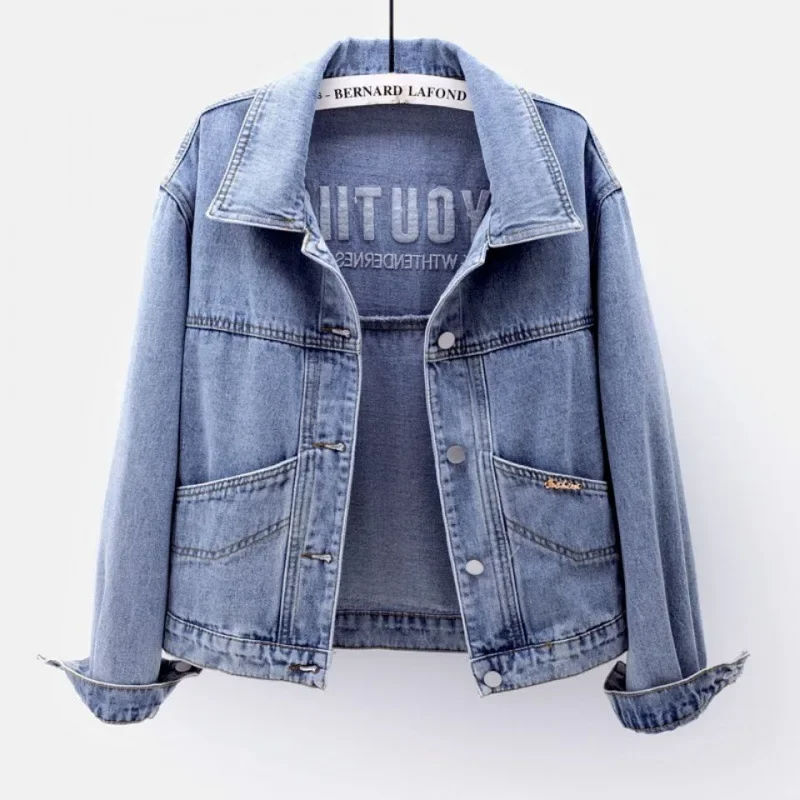 แจ็คเก็ตยีนส์ครอปของผู้หญิงสไตล์เกาหลีทรงหลวมเข้ารูปปักลายสีพื้นใหม่ฤดูใบไม้ผลิ2024