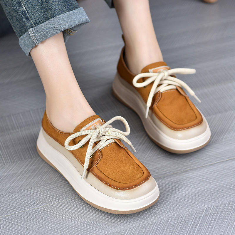 2024รองเท้าผ้าใบหนังวัวแท้ของผู้หญิงแบบย้อนยุค, รองเท้าลำลองระบายอากาศพื้นหนารองเท้าสไตล์ร้อนแรงนุ่มสำหรับฤดูใบไม้ผลิฤดูร้อน