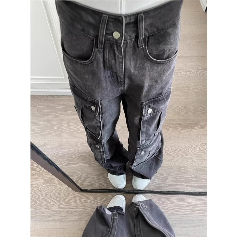 กางเกงยีนส์2024ไล่ระดับสีอเมริกันย้อนยุคของผู้หญิงสำหรับฤดูใบไม้ผลิฤดูร้อนชุดทำงานทรงหลวมมีกระเป๋าหลายช่องกว้าง