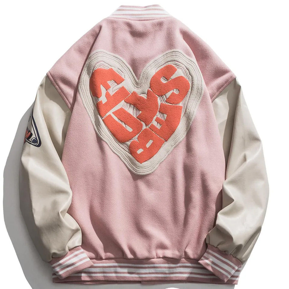 เสื้อแจ็กเก็ตเบสบอลลายรักแนวสตรีทของ2024เสื้อฮิปฮอปเย็บปะติดปะต่อกันพิมพ์ตัวอักษรเสื้อแจ็คเก็ตตัวแทนเสื้อนอกฤดูใบไม้ร่วง