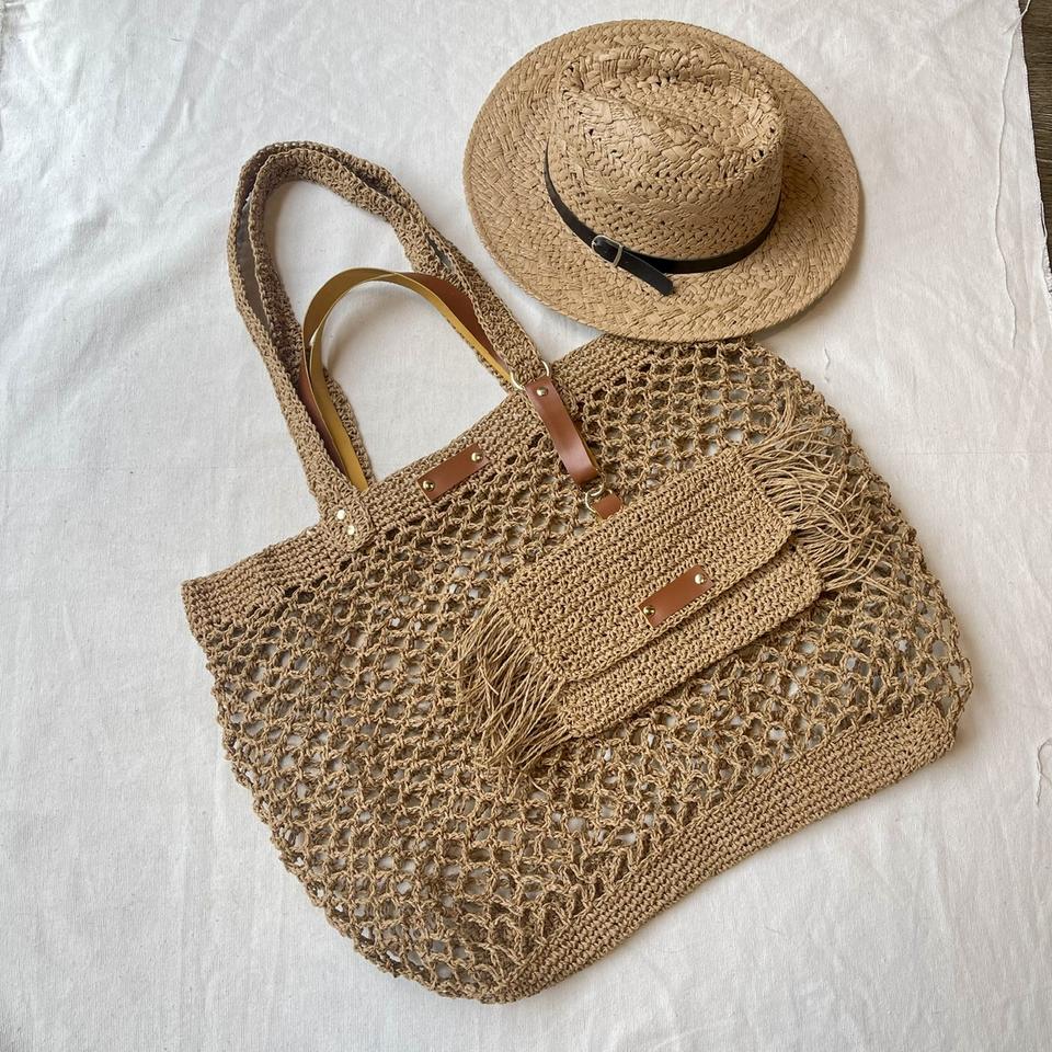 กระเป๋า2024ฤดูร้อนสุดฮอตกระเป๋าสานด้วยมือสไตล์โบฮีเมียนกระเป๋าตาข่ายกระดาษสามาพร้อมกับสายหนังแท้และกระเป๋าขนาดเล็ก