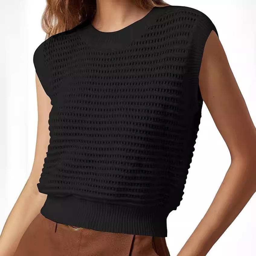 สเวตเตอร์ลายฉลุแขนกุดผ้าอะคริลิคของผู้ชายเสื้อสเวตเตอร์แบบโปร่งสไตล์สั้นคอกลมเข้ารูปสำหรับฤดูร้อน2024