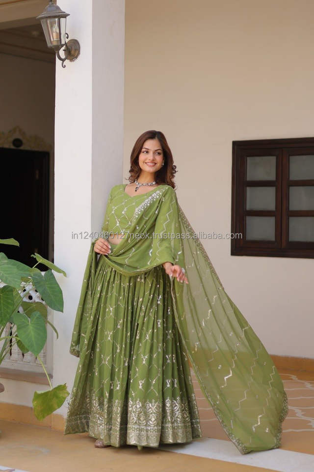 ชุดเดรสยาวคอวีคอวีสำหรับ2024ฤดูร้อนผ้าจอร์เจียสำหรับผู้หญิงทำงานปักลำดับงานงานเทศกาล lehenga choli