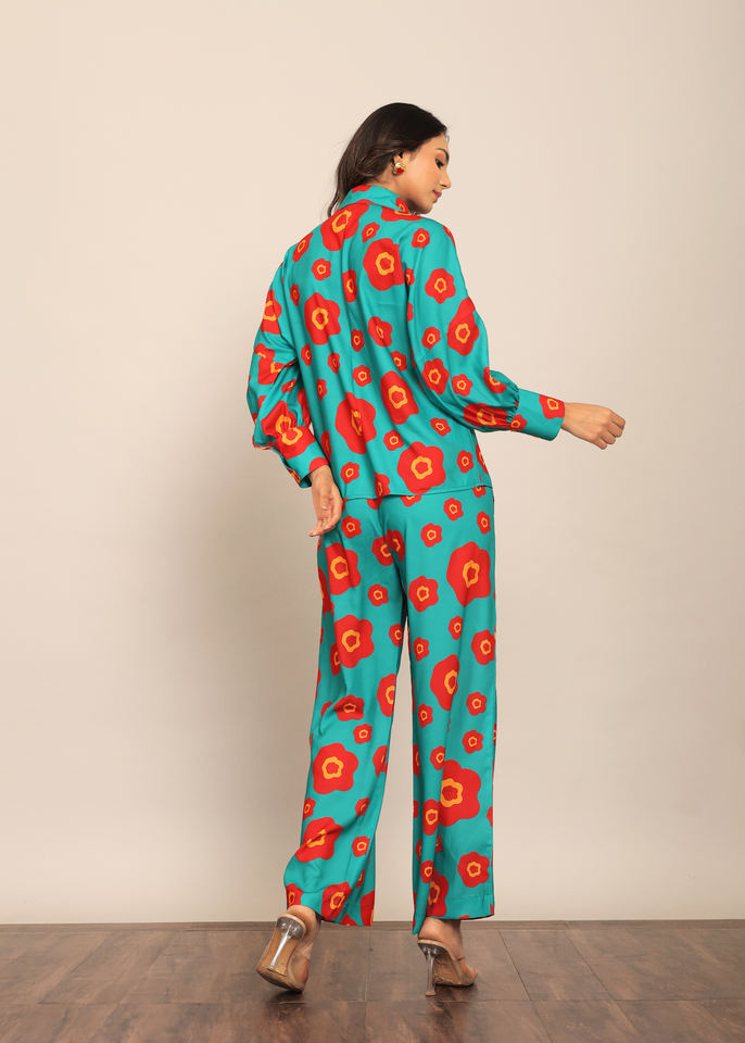 Product Name:Sea Green and Red Floral Printed Relaxed Shirt with Collar