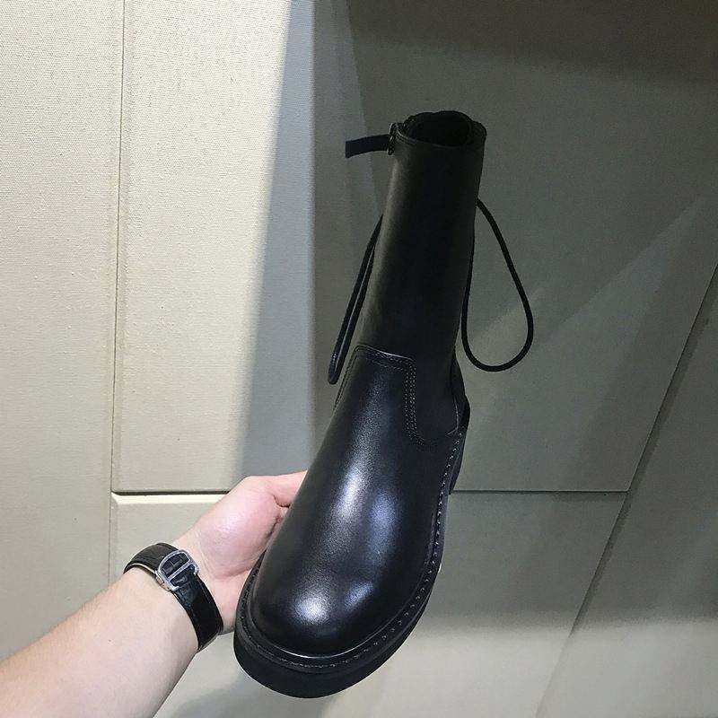 Yicheng บูทหนังวัวมีเชือกผูก, เทรนด์2024รองเท้าบูทมีซิปแบบเกาหลีหัวรองเท้ามนหรือไนท์คลับกลางแจ้ง