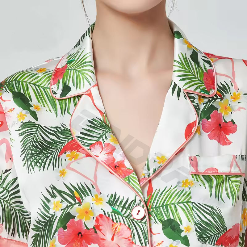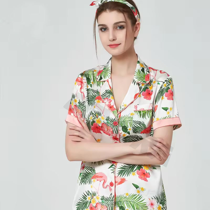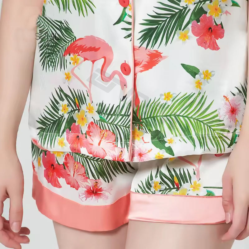 2024 Wholesale Warmly Flamingo Printed Short Sleeve 100%Silk Pajamas Sleepwear Nightwear for Women Set Spaghetti Strap