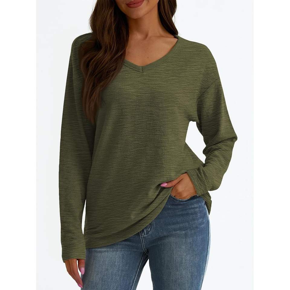 เสื้อยืดคอวีแขนยาวโอเวอร์ไซส์ของผู้หญิง2025 2025เสื้อสวมหัวลำลองแบบเรียบง่ายเสื้อท่อนบนผ้าฝ้ายน้ำหนักเบาเสื้อยืดธรรมดา