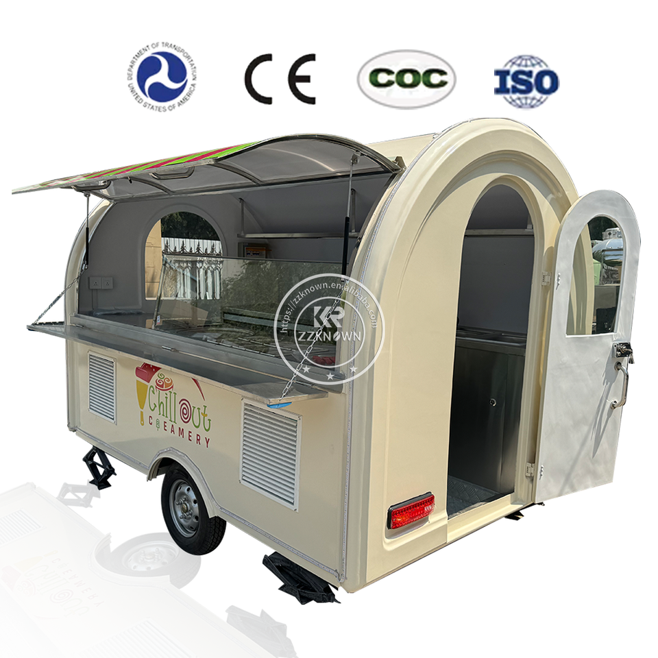 รถพ่วงขายอาหารทรงกลมขนาดเล็ก ปี 2025 ทำจากสแตนเลส 304 ได้รับใบรับรอง CE สำหรับขายอาหารว่างและอาหารริมทาง