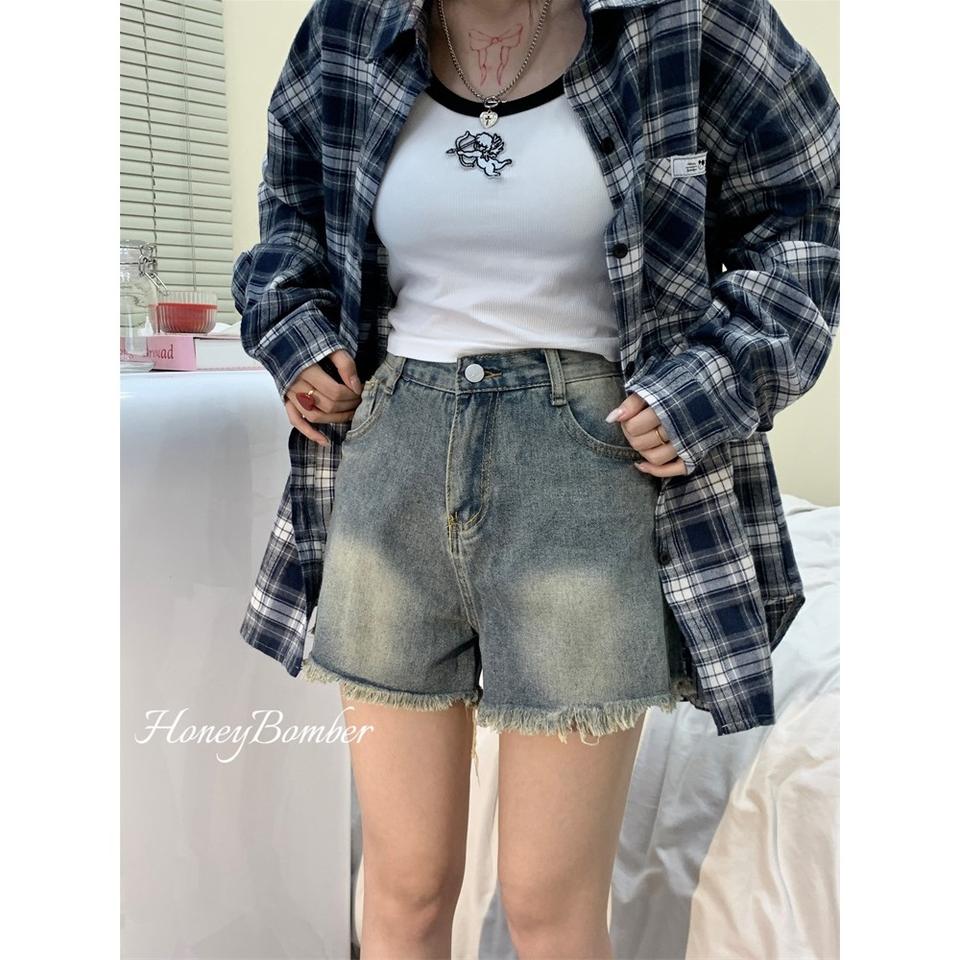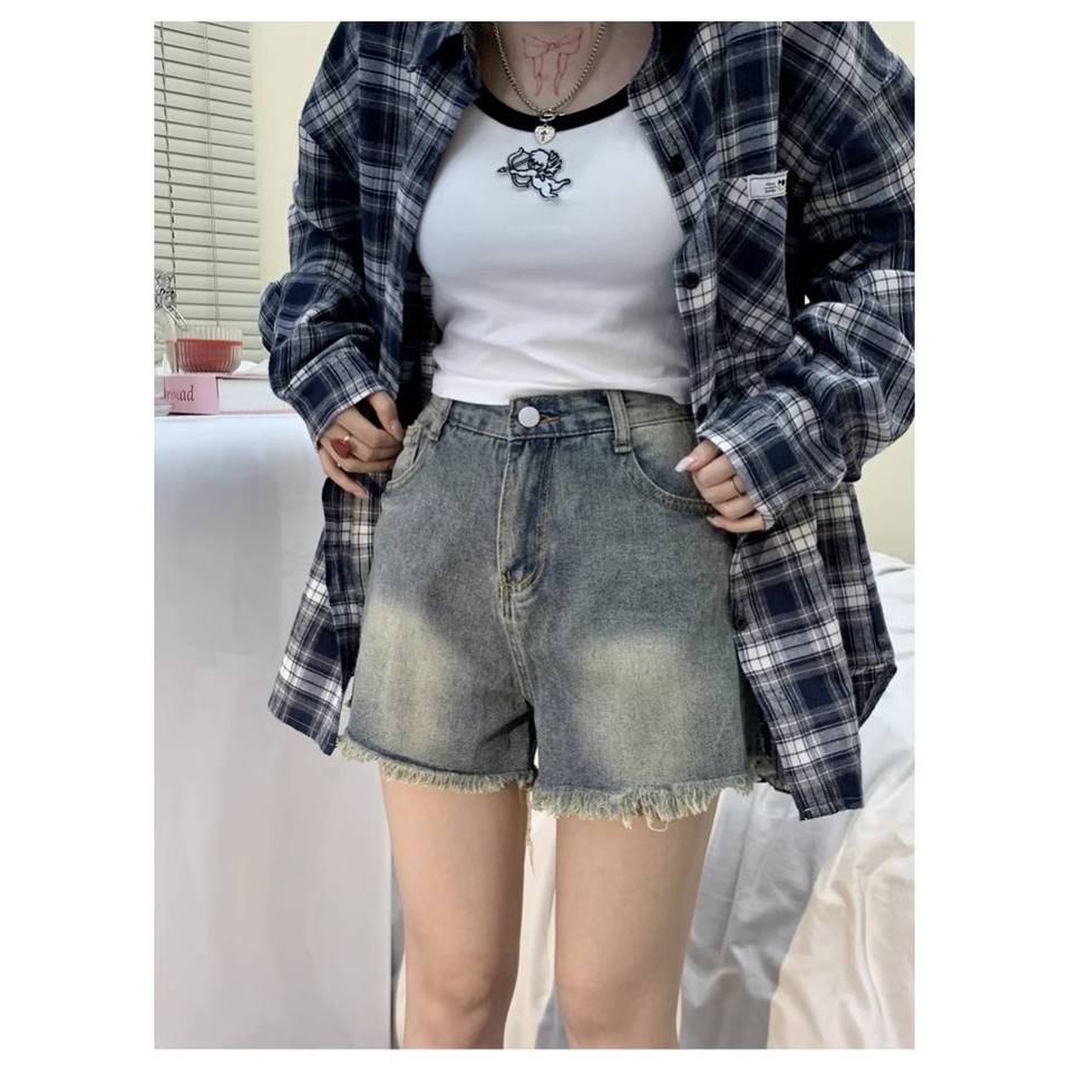 กางเกงยีนส์ขาสั้นย้อนยุคอเมริกันสำหรับผู้หญิง2025ฤดูร้อน