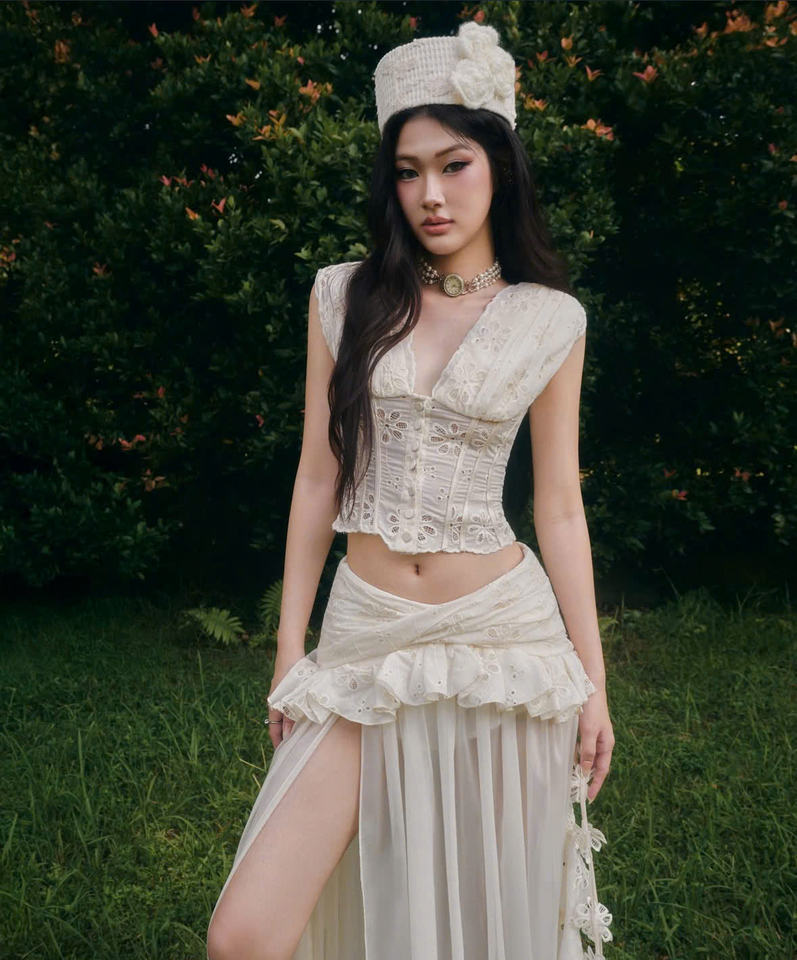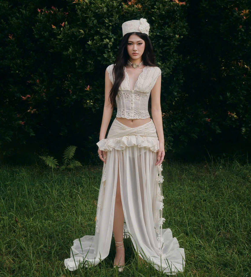 เครื่องประดับ:กระดุม, lace, ruched, ruffles, เย็บปักถักร้อย, Appliques, ผ่าสูง