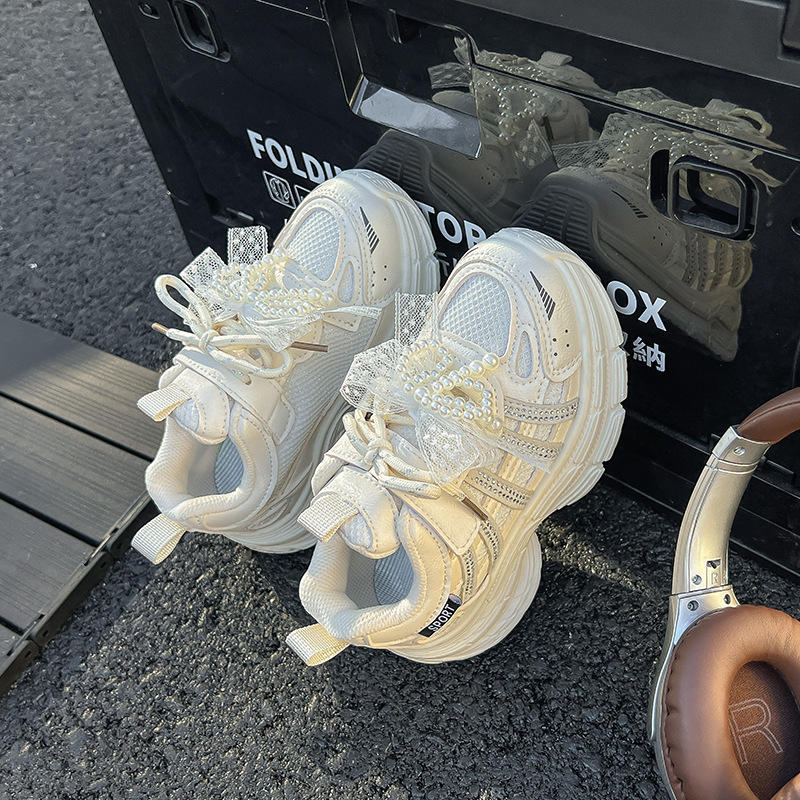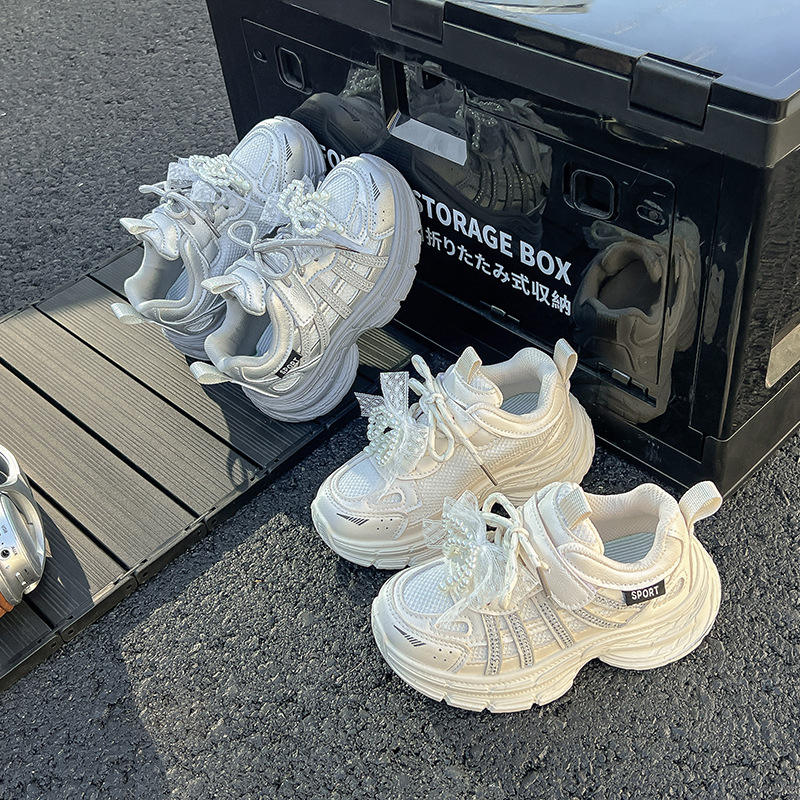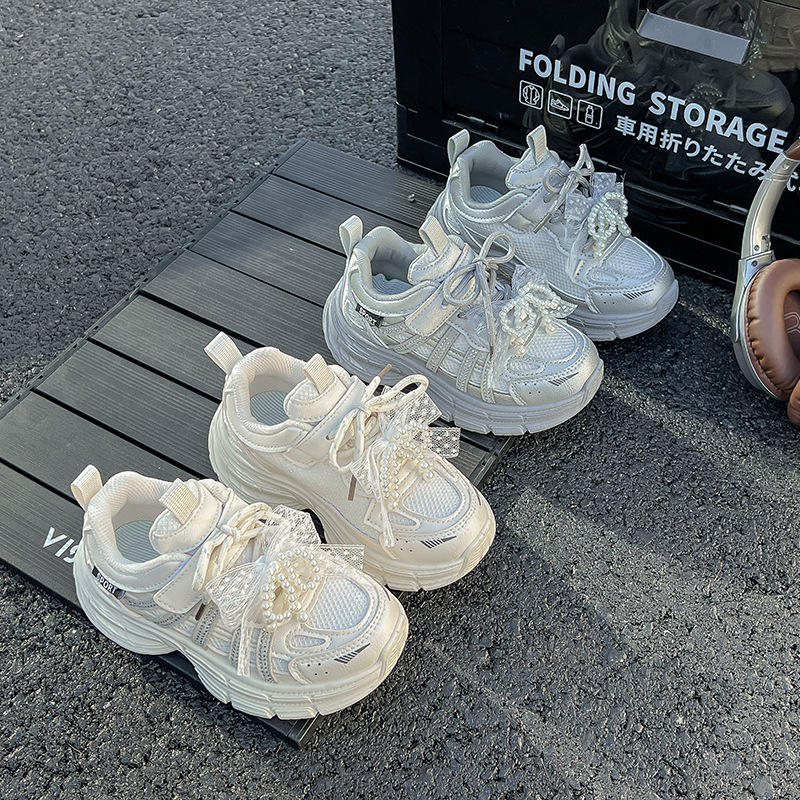 รองเท้ากีฬาเด็กผู้หญิงประดับโบว์มุก รุ่นฤดูใบไม้ร่วงปี 2025 แฟชั่นลำลอง ระบายอากาศได้ดี รองเท้าเด็กผู้ชายแบบ Dad Shoes สีขาวงาช้าง/สีเงิน
