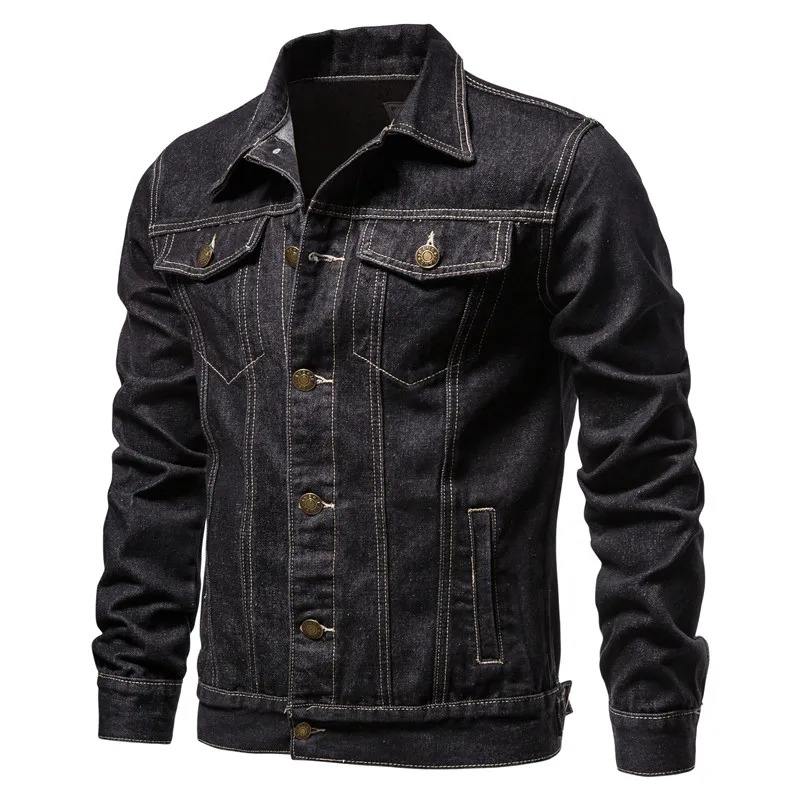 แจ็กเก็ตยีนส์ลำลองเข้ารูปผ้าฝ้ายสำหรับผู้ชาย, เสื้อโค้ทแปรรูปย้อมสีพื้นสีดำสีน้ำเงิน2025ฤดูใบไม้ร่วง