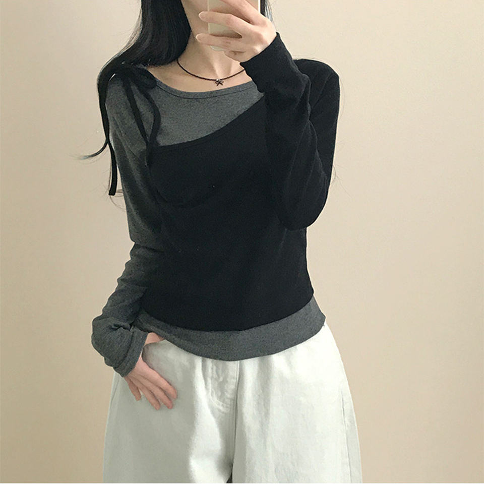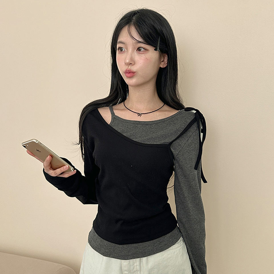 เสื้อยืดถักลายบล็อกสีสำหรับผู้หญิง คอลเลคชั่นฤดูใบไม้ร่วง 2025 | เสื้อสวมหัวแขนยาวผ้าโมดอลคอตตอนทรงสลิมฟิตลำลองกันยับ