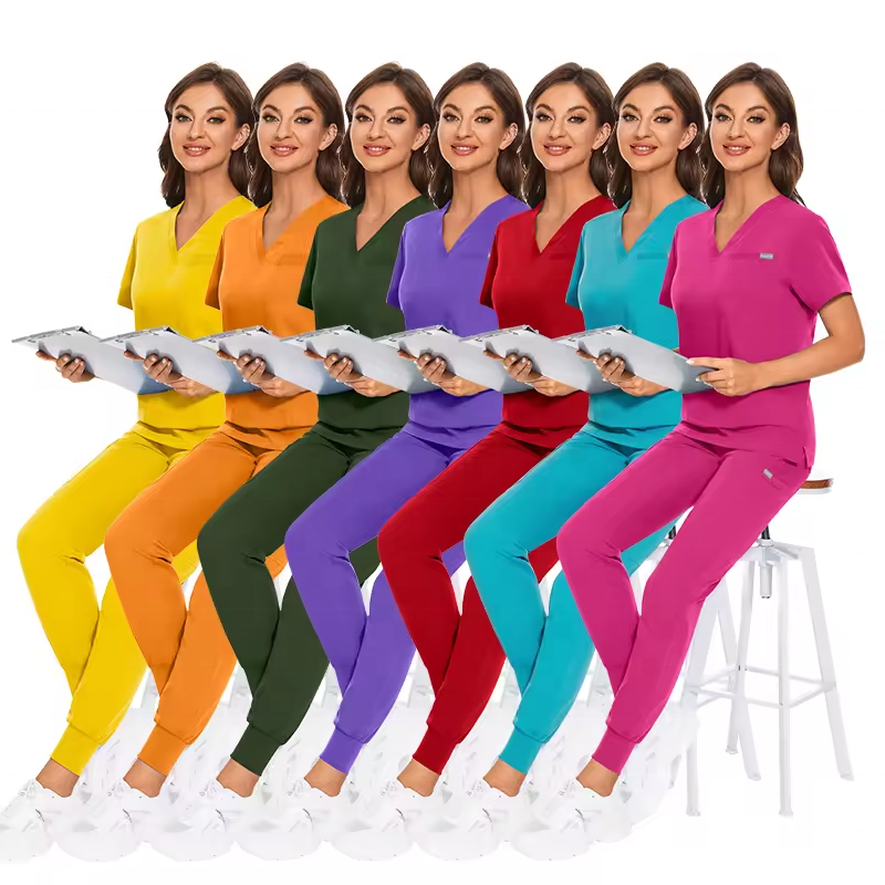 ชุดสครับ2025สวมใส่สบายหลากสีแขนสั้นเข้ารูปสำหรับผู้หญิงทำงานในโรงพยาบาลใหม่ฤดูใบไม้ร่วง
