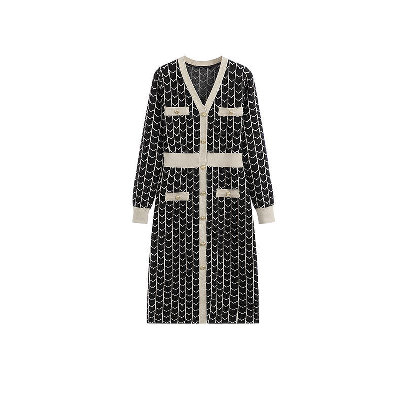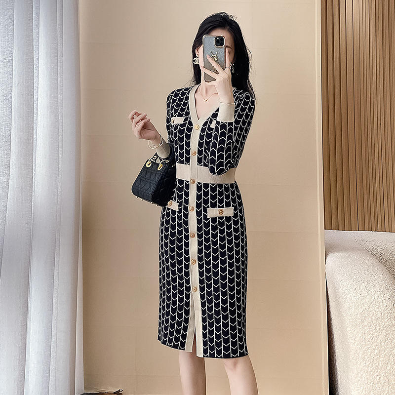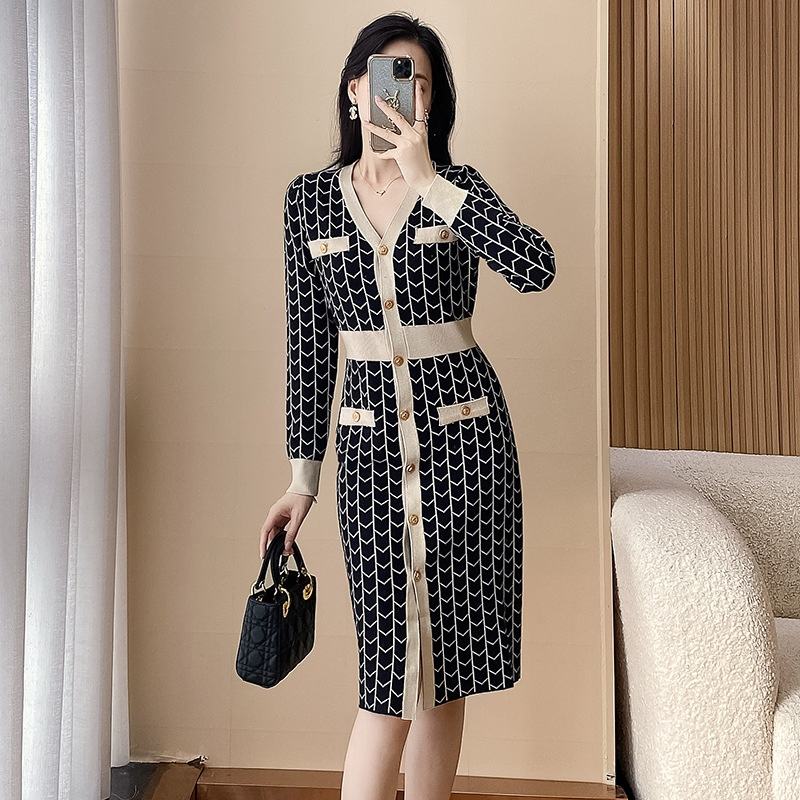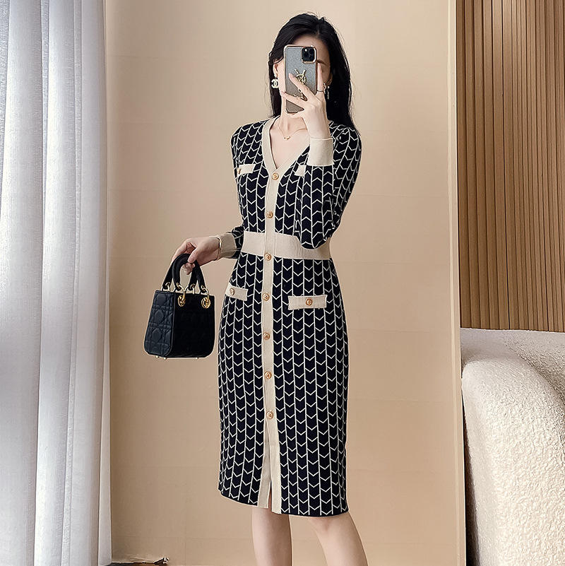 เดรสไหมพรมคอวีเล็กๆ ระบายอากาศได้ดี สไตล์วินเทจลำลอง ลายเรขาคณิตแบบฝรั่งเศส ทรงเอไลน์ยาวคลุมเท้า สำหรับฤดูใบไม้ร่วง-ฤดูหนาว ปี 2025