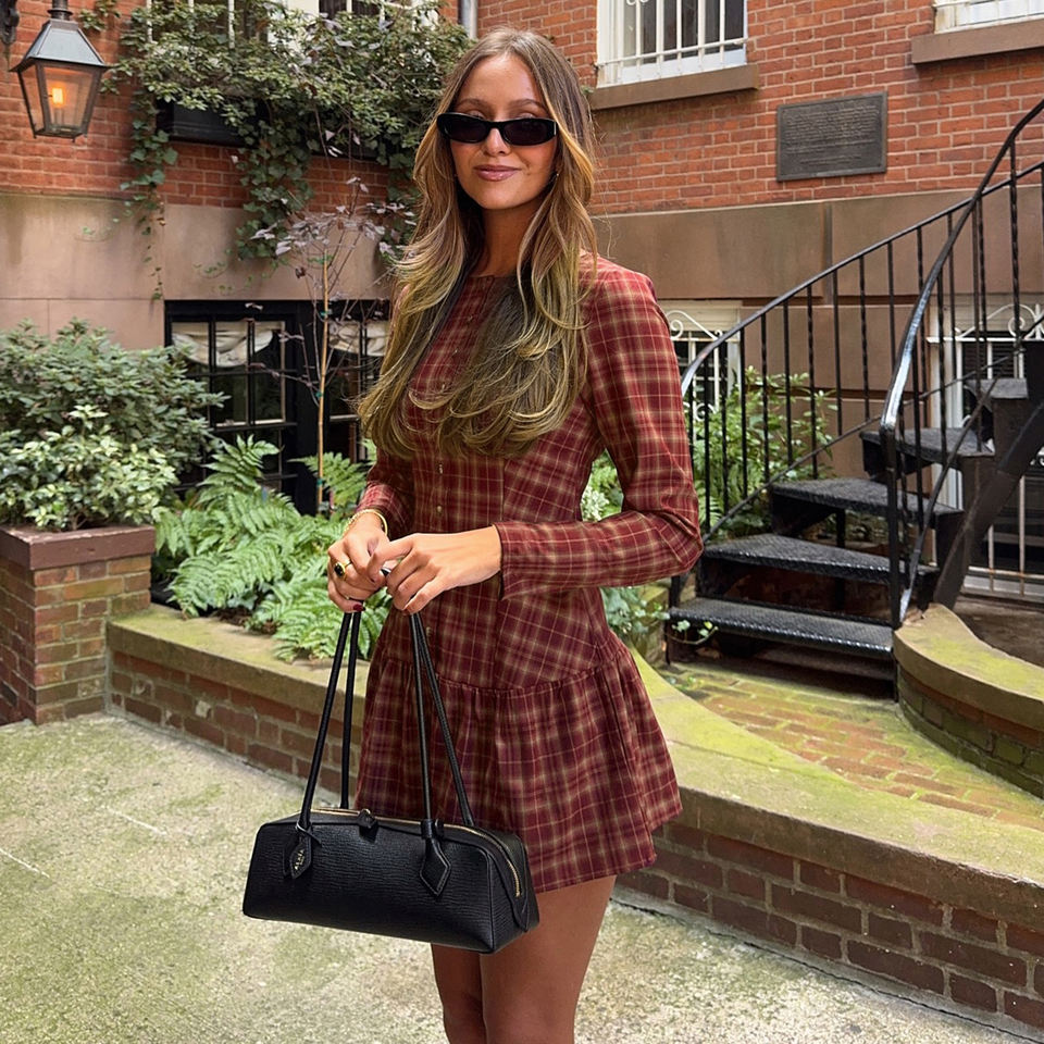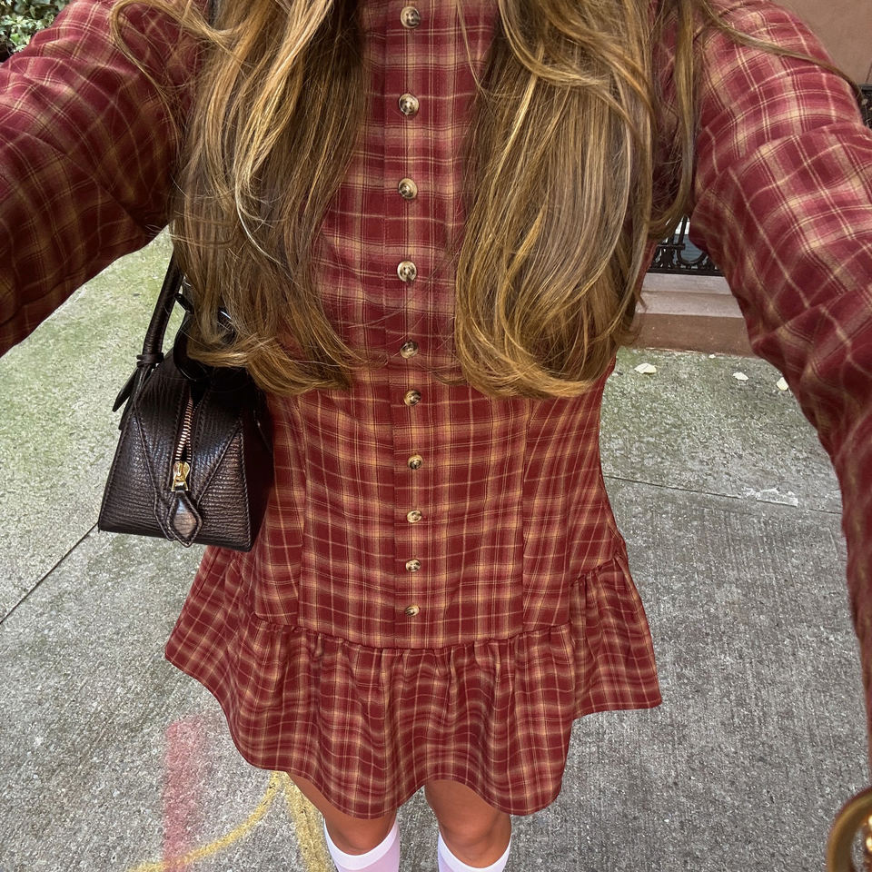 เดรสสไตล์พรีปปี้ ปี 2025 หวานละมุน ผ้าทอธรรมชาติ กระโปรงทรงตรงลายสก็อตสำหรับผู้หญิง พร้อมลายพิมพ์และกระดุม เซ็กซี่ น่ารัก รับผลิตแบบ OEM