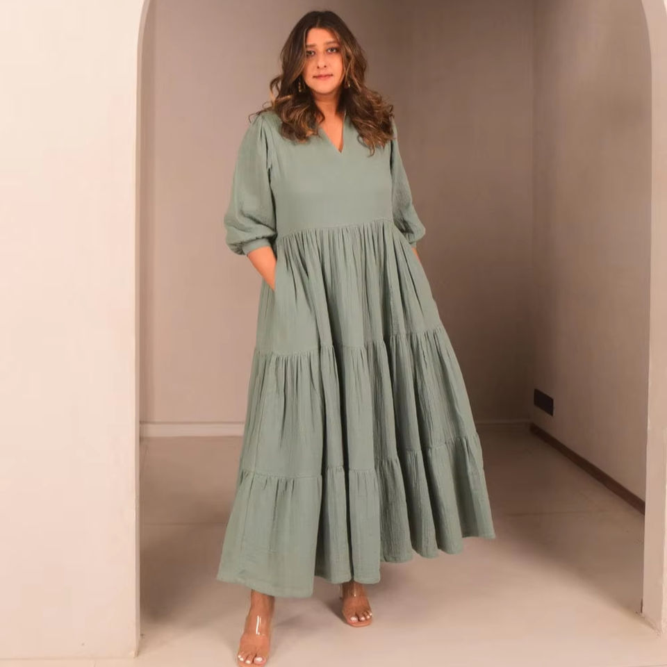 2025ชุดเดรสยาวคอปกตั้งทำจากผ้าเรยอน100% แขนยาวสไตล์โบฮีเมียนสำหรับผู้หญิงชุดเดรสยาวคอวีสำหรับวันหยุด