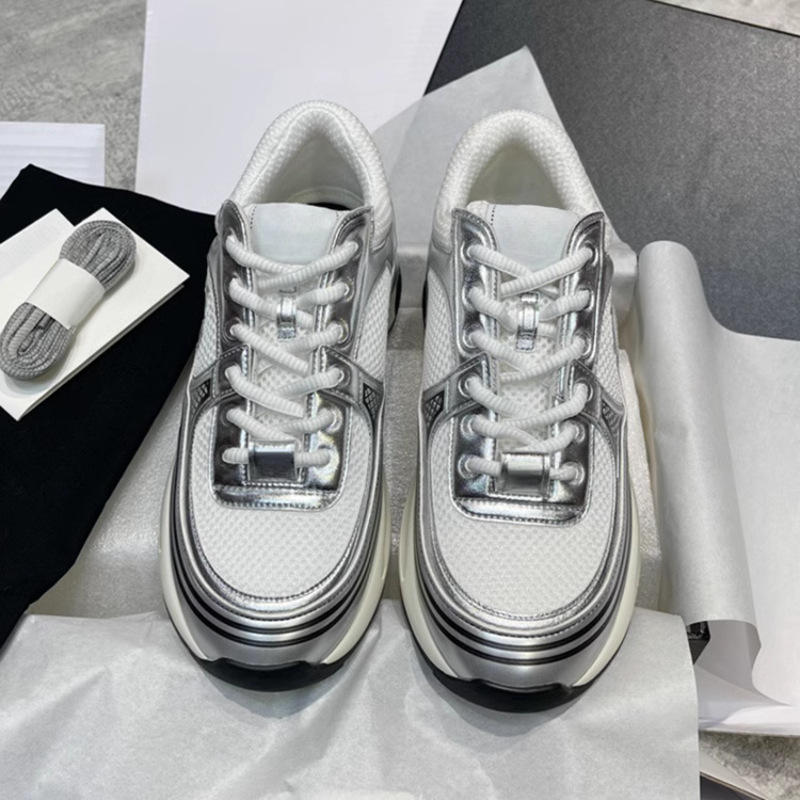 รองเท้ากีฬาลำลองแบรนด์ดังปี 2025 สำหรับผู้ชายและผู้หญิง บุหนังแท้ แบบผูกเชือก เพิ่มความสูง สีเงิน